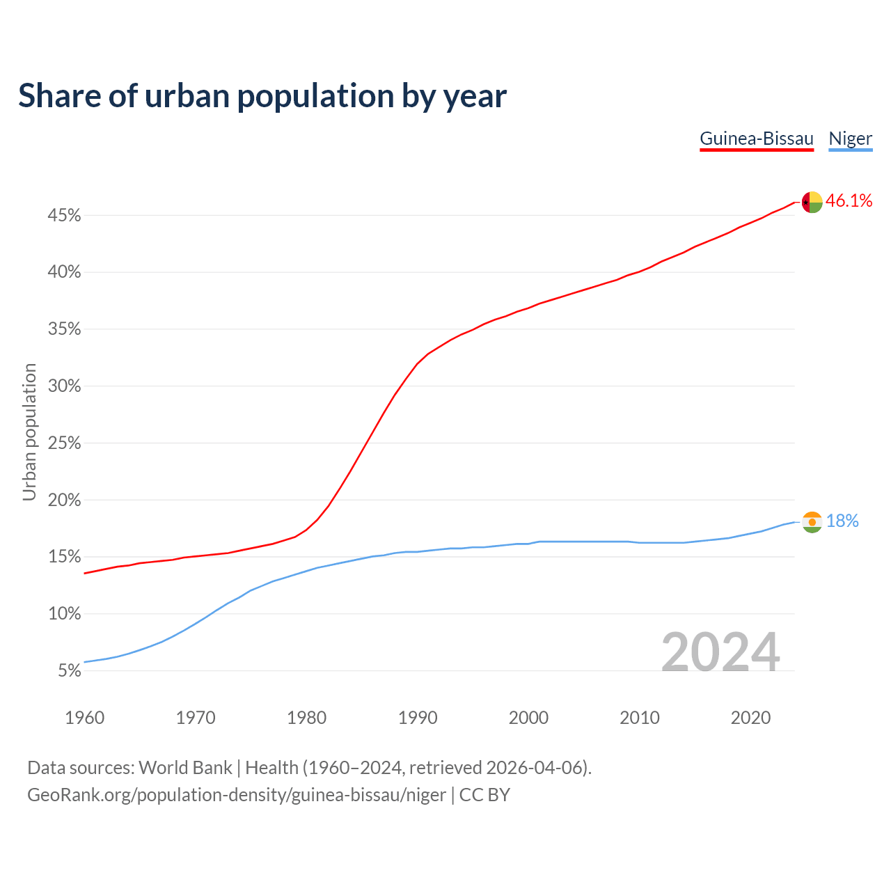 From 2004 to 2024, the share of urban population changed from 38.1% to 46.1% in Guinea-Bissau and from 16.3% to 18% in Niger.