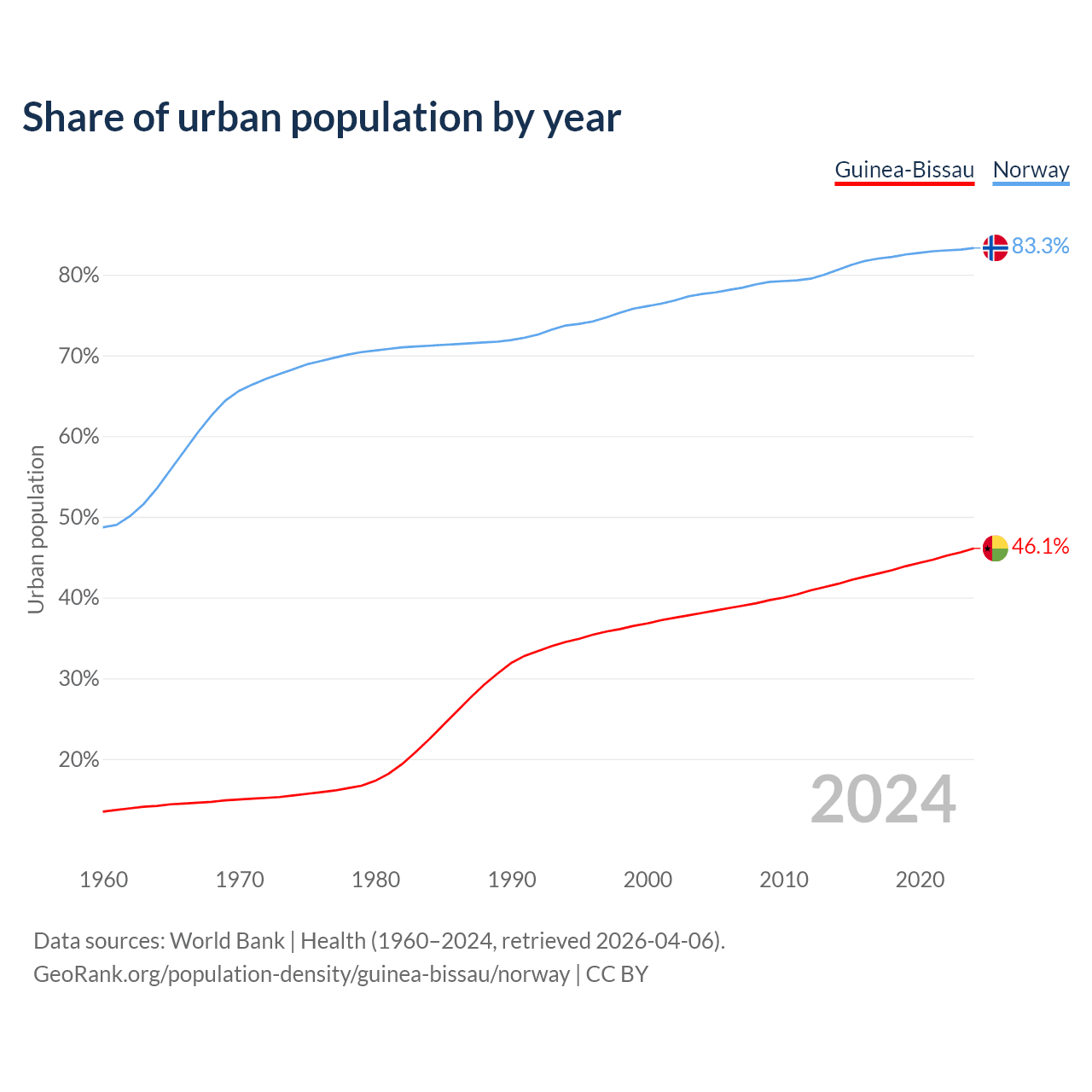 From 2004 to 2024, the share of urban population changed from 38.1% to 46.1% in Guinea-Bissau and from 77.6% to 83.3% in Norway.