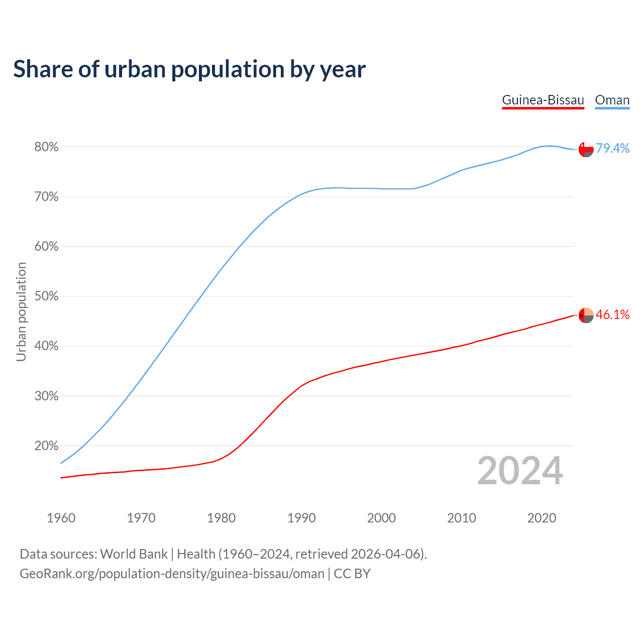 From 2004 to 2024, the share of urban population changed from 38.1% to 46.1% in Guinea-Bissau and from 71.5% to 79.4% in Oman.