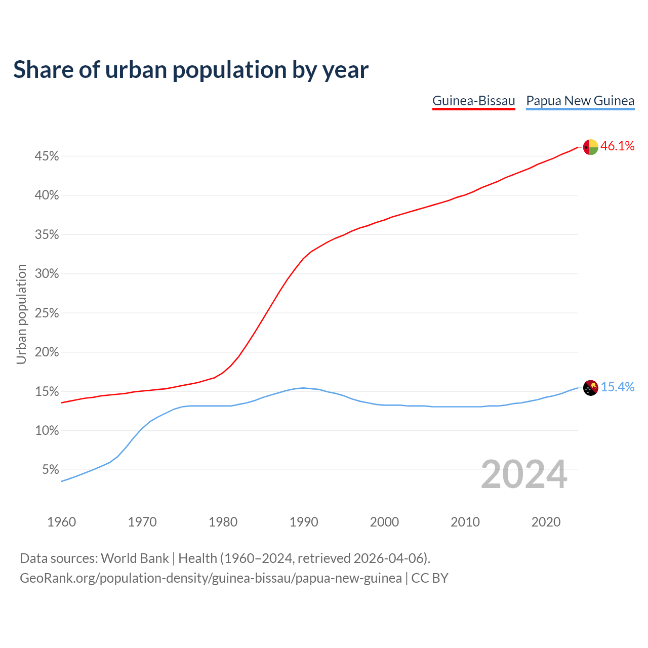 From 2004 to 2024, the share of urban population changed from 38.1% to 46.1% in Guinea-Bissau and from 13.1% to 15.4% in Papua New Guinea.