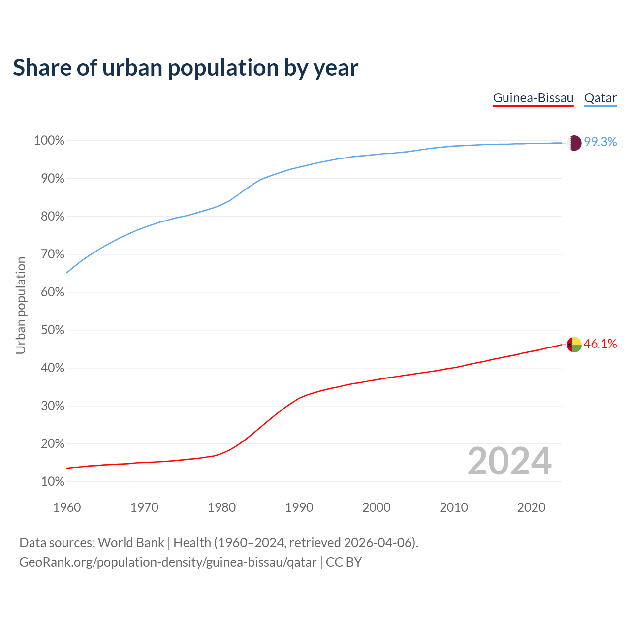 From 2004 to 2024, the share of urban population changed from 38.1% to 46.1% in Guinea-Bissau and from 97% to 99.3% in Qatar.
