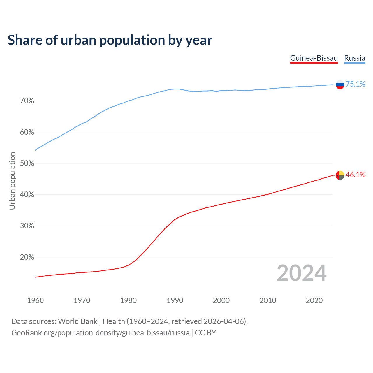 From 2004 to 2024, the share of urban population changed from 38.1% to 46.1% in Guinea-Bissau and from 73.3% to 75.1% in Russia.