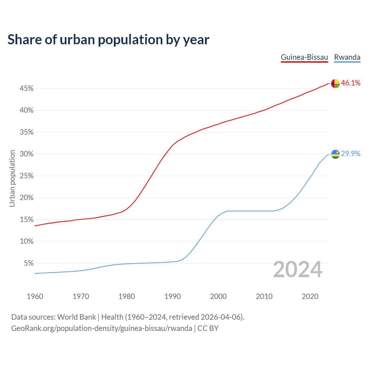 From 2004 to 2024, the share of urban population changed from 38.1% to 46.1% in Guinea-Bissau and from 16.9% to 29.9% in Rwanda.