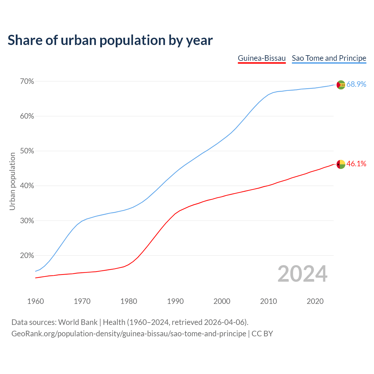 From 2004 to 2024, the share of urban population changed from 38.1% to 46.1% in Guinea-Bissau and from 57.9% to 68.9% in Sao Tome and Principe.