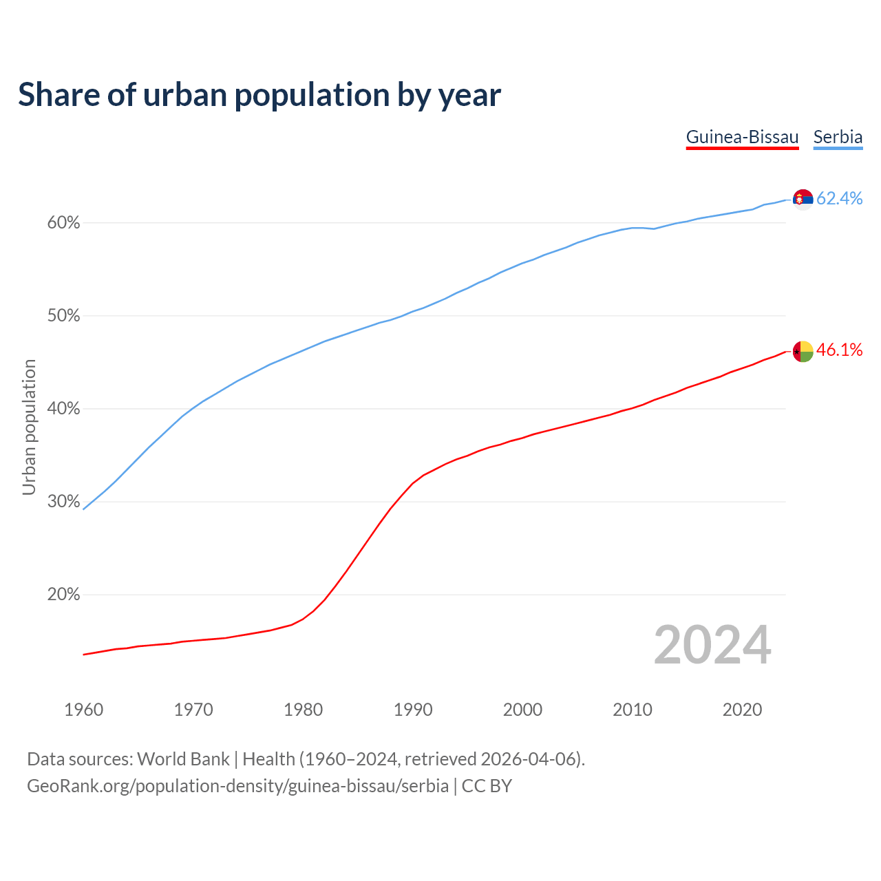 From 2004 to 2024, the share of urban population changed from 38.1% to 46.1% in Guinea-Bissau and from 57.3% to 62.4% in Serbia.