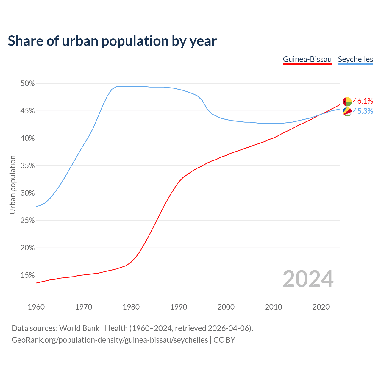 From 2004 to 2024, the share of urban population changed from 38.1% to 46.1% in Guinea-Bissau and from 42.9% to 45.3% in the Seychelles.