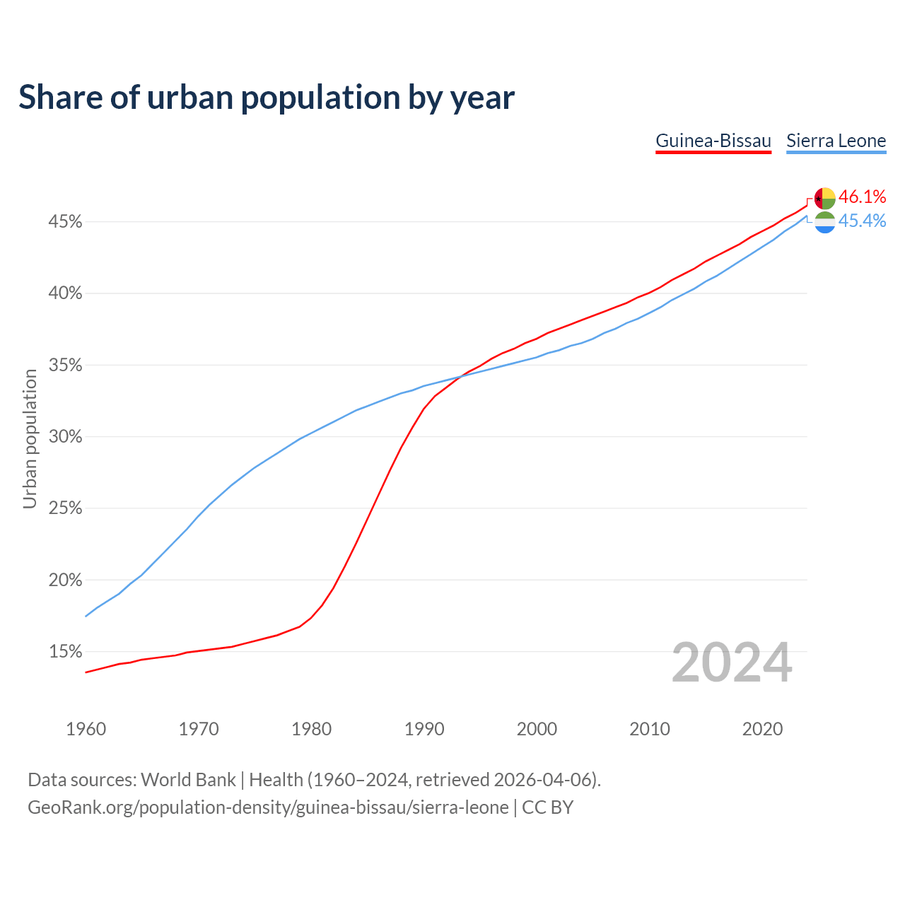From 2004 to 2024, the share of urban population changed from 38.1% to 46.1% in Guinea-Bissau and from 36.5% to 45.4% in Sierra Leone.
