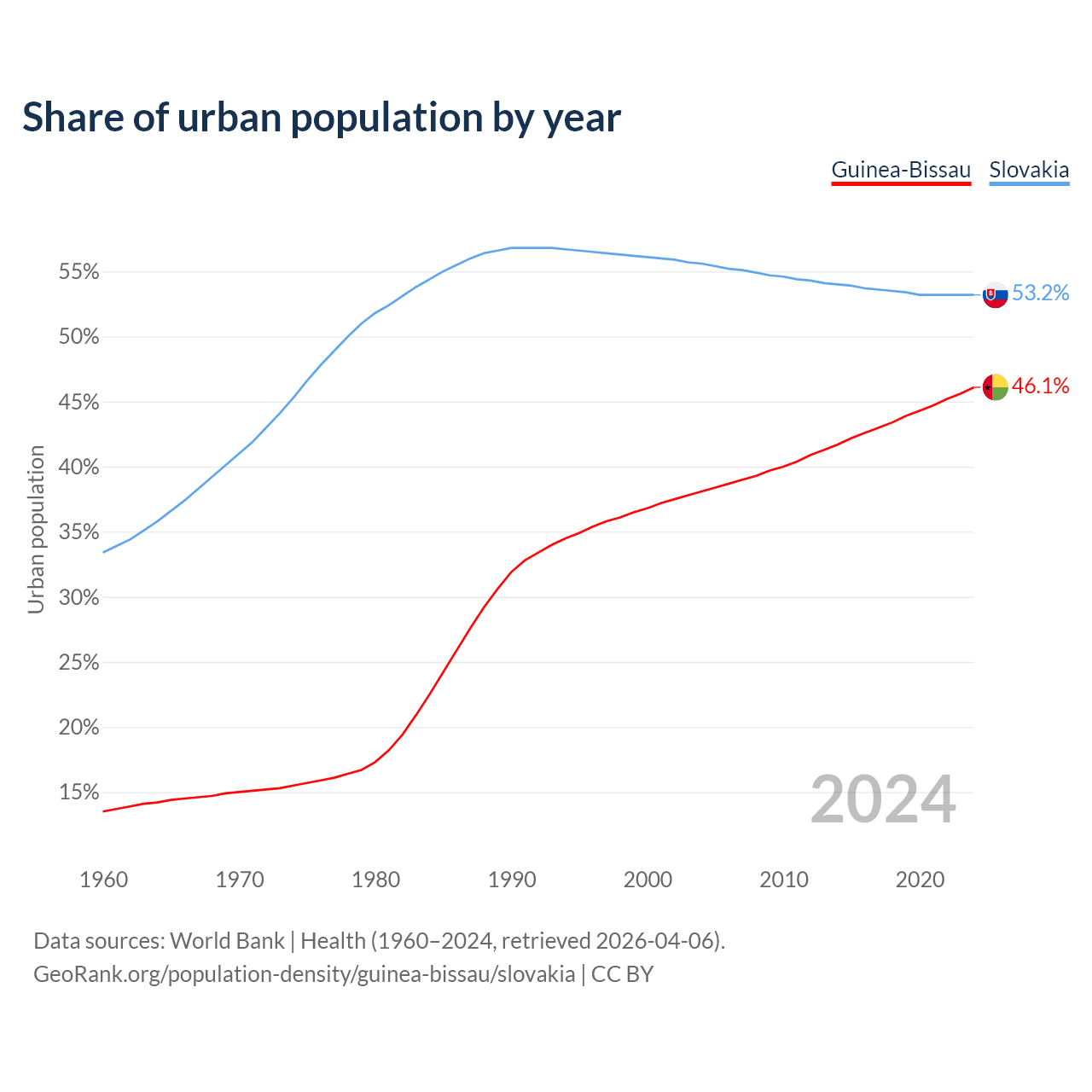 From 2004 to 2024, the share of urban population changed from 38.1% to 46.1% in Guinea-Bissau and from 55.6% to 53.2% in Slovakia.