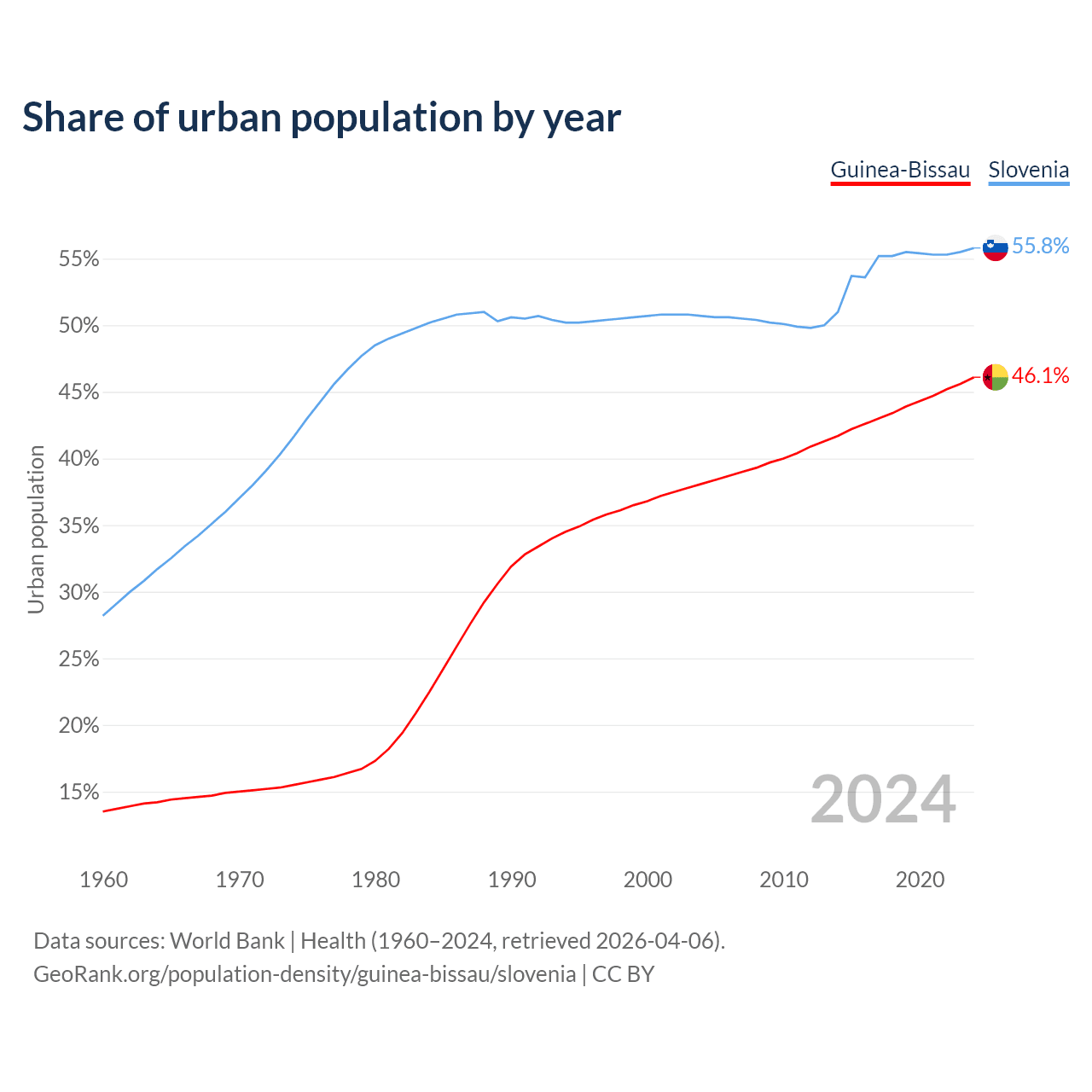 From 2004 to 2024, the share of urban population changed from 38.1% to 46.1% in Guinea-Bissau and from 50.7% to 55.8% in Slovenia.