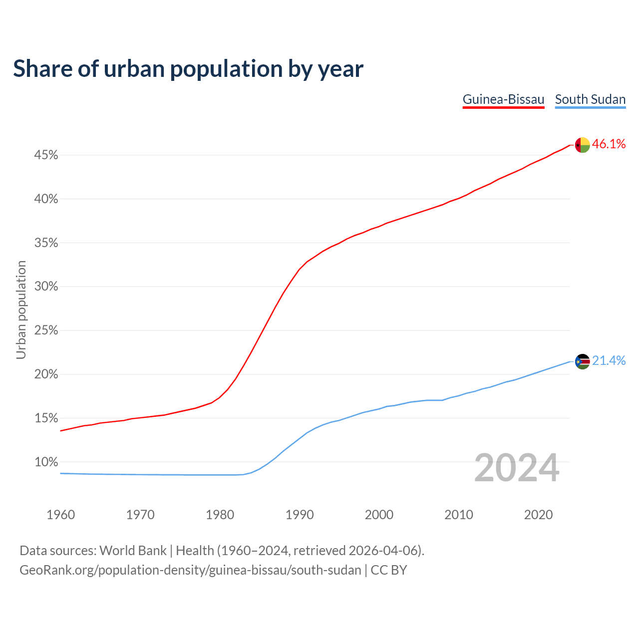 From 2004 to 2024, the share of urban population changed from 38.1% to 46.1% in Guinea-Bissau and from 16.8% to 21.4% in South Sudan.