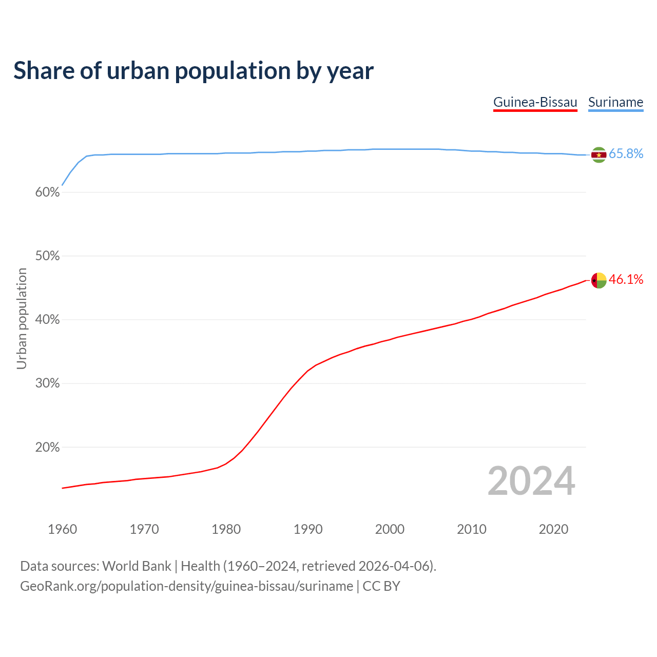 From 2004 to 2024, the share of urban population changed from 38.1% to 46.1% in Guinea-Bissau and from 66.7% to 65.8% in Suriname.
