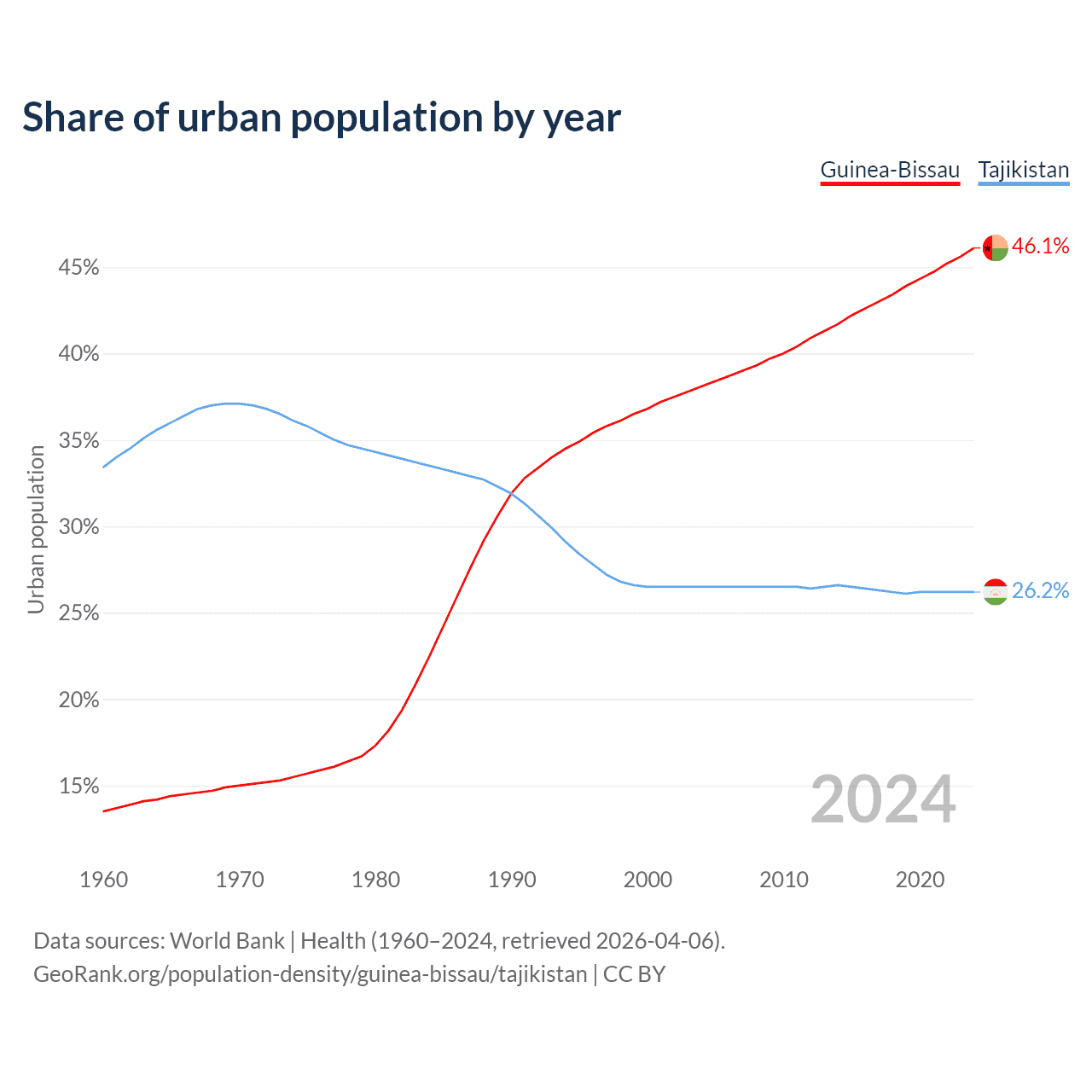 From 2004 to 2024, the share of urban population changed from 38.1% to 46.1% in Guinea-Bissau and from 26.5% to 26.2% in Tajikistan.