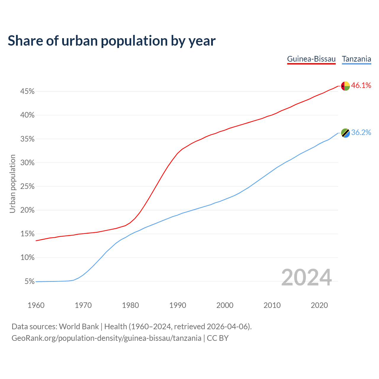 From 2004 to 2024, the share of urban population changed from 38.1% to 46.1% in Guinea-Bissau and from 24.1% to 36.2% in Tanzania.