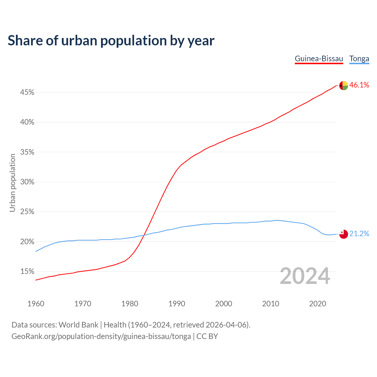 From 2004 to 2024, the share of urban population changed from 38.1% to 46.1% in Guinea-Bissau and from 23.1% to 21.2% in Tonga.