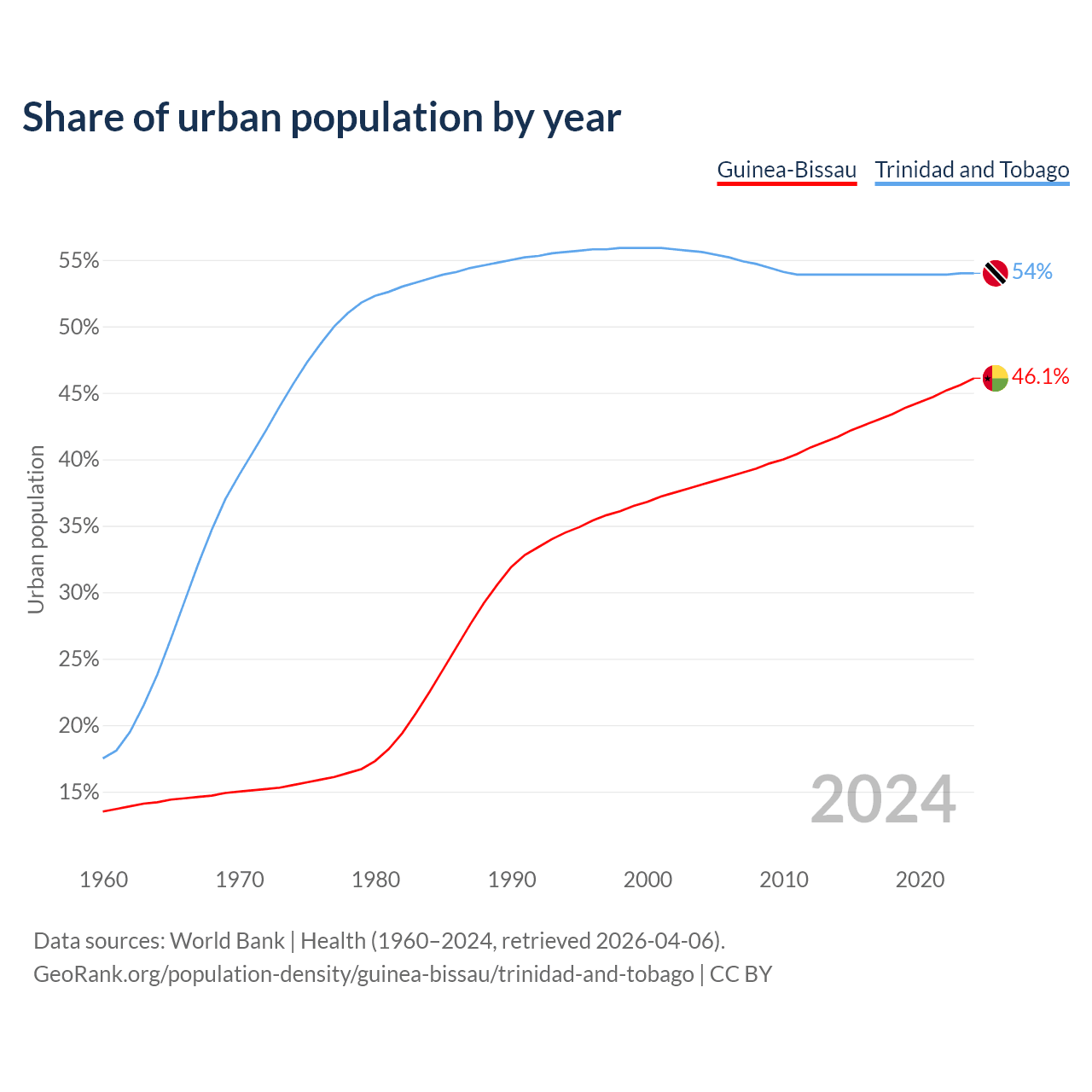 From 2004 to 2024, the share of urban population changed from 38.1% to 46.1% in Guinea-Bissau and from 55.6% to 54% in Trinidad and Tobago.