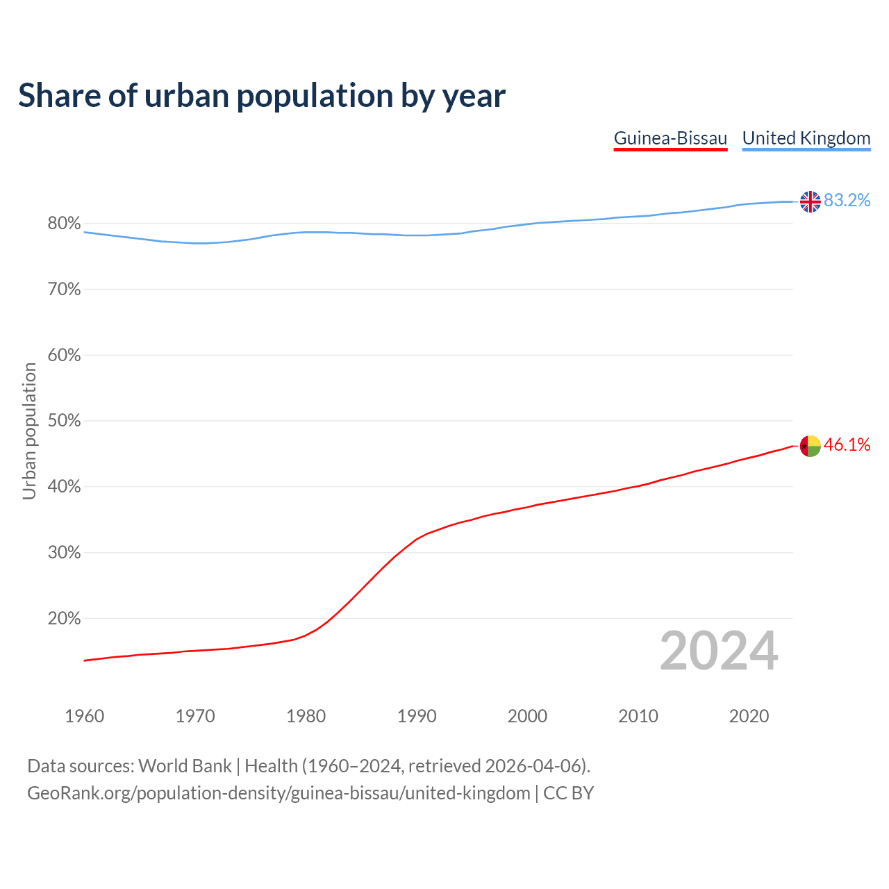 From 2006 to 2026, population density in Guinea-Bissau increased by 62.4%, compared to a 15.1% growth in the United Kingdom.