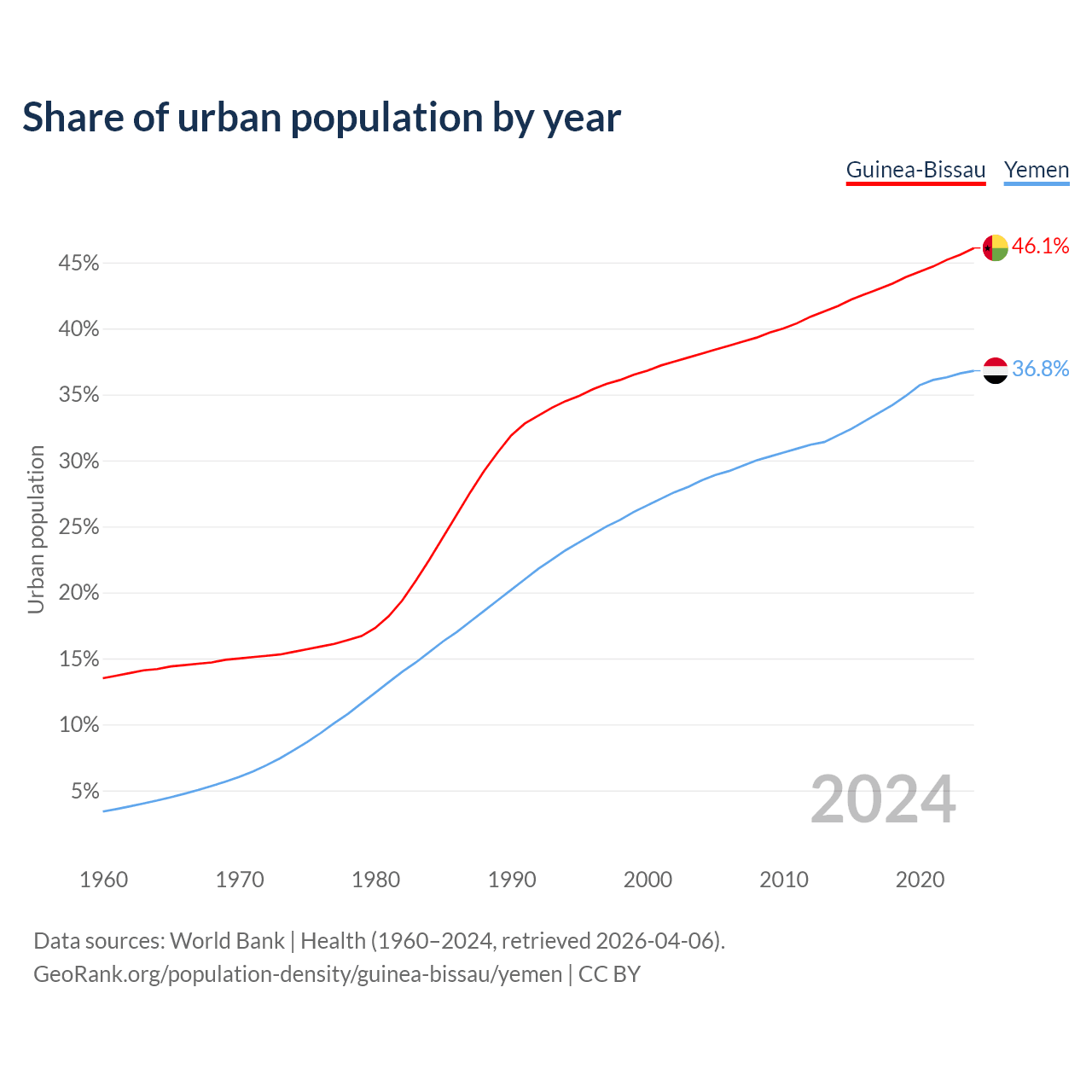 From 2004 to 2024, the share of urban population changed from 38.1% to 46.1% in Guinea-Bissau and from 28.5% to 36.8% in Yemen.