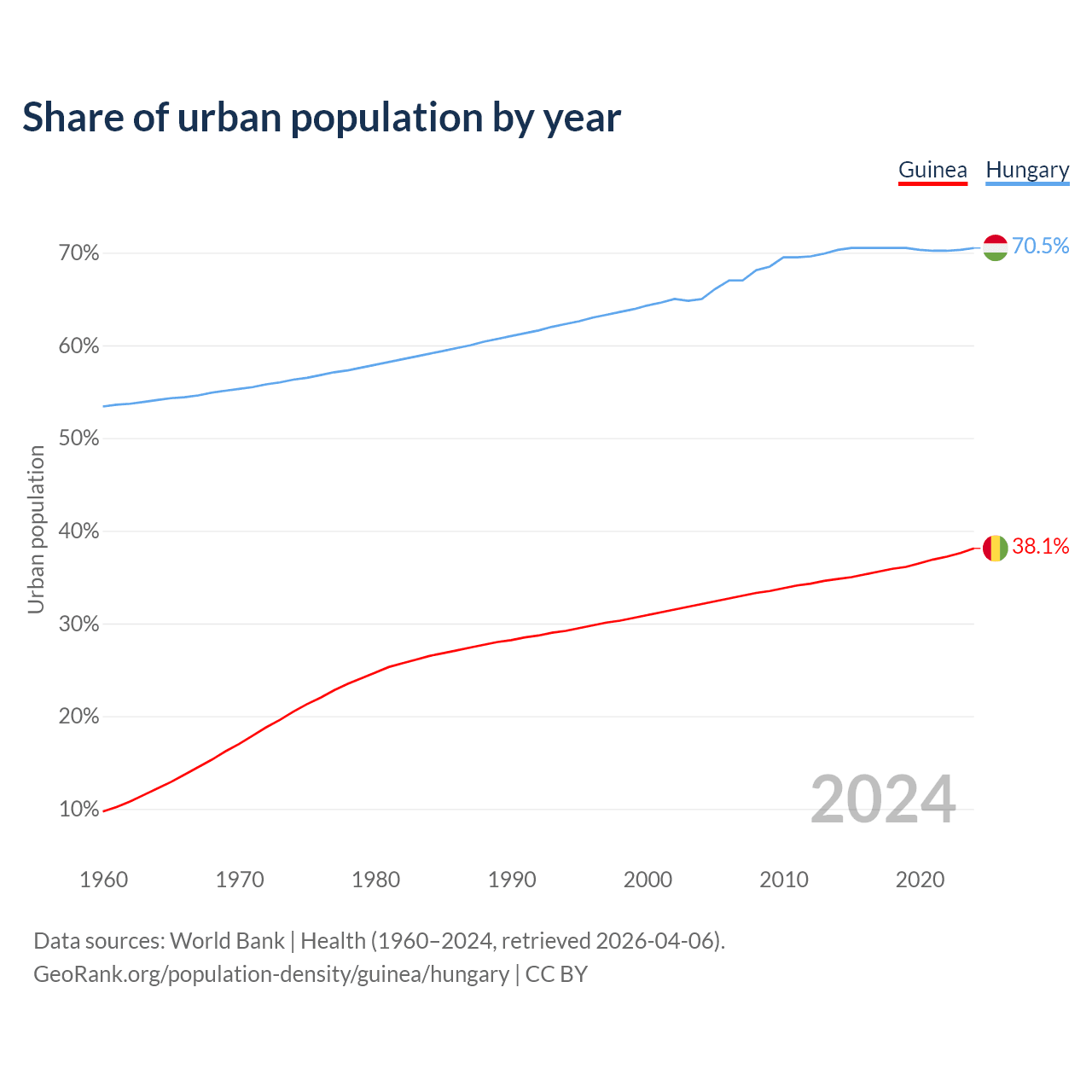From 2004 to 2024, the share of urban population changed from 32.1% to 38.1% in Guinea and from 65% to 70.5% in Hungary.