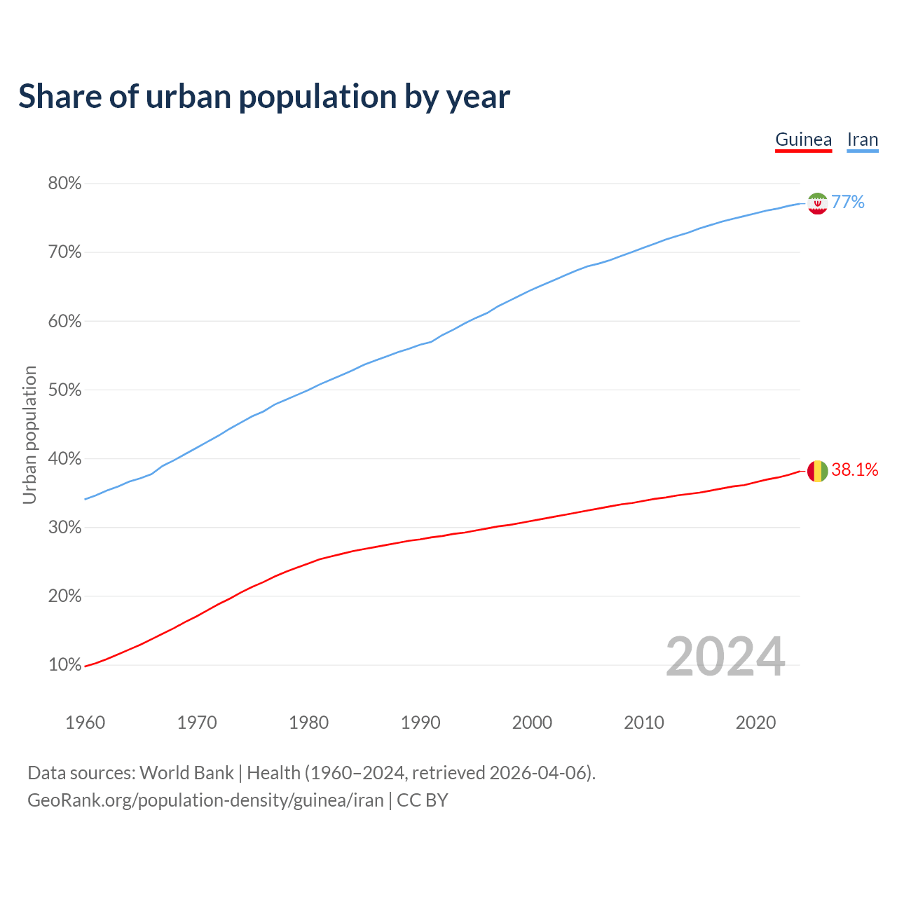 From 2004 to 2024, the share of urban population changed from 32.1% to 38.1% in Guinea and from 67.3% to 77% in Iran.