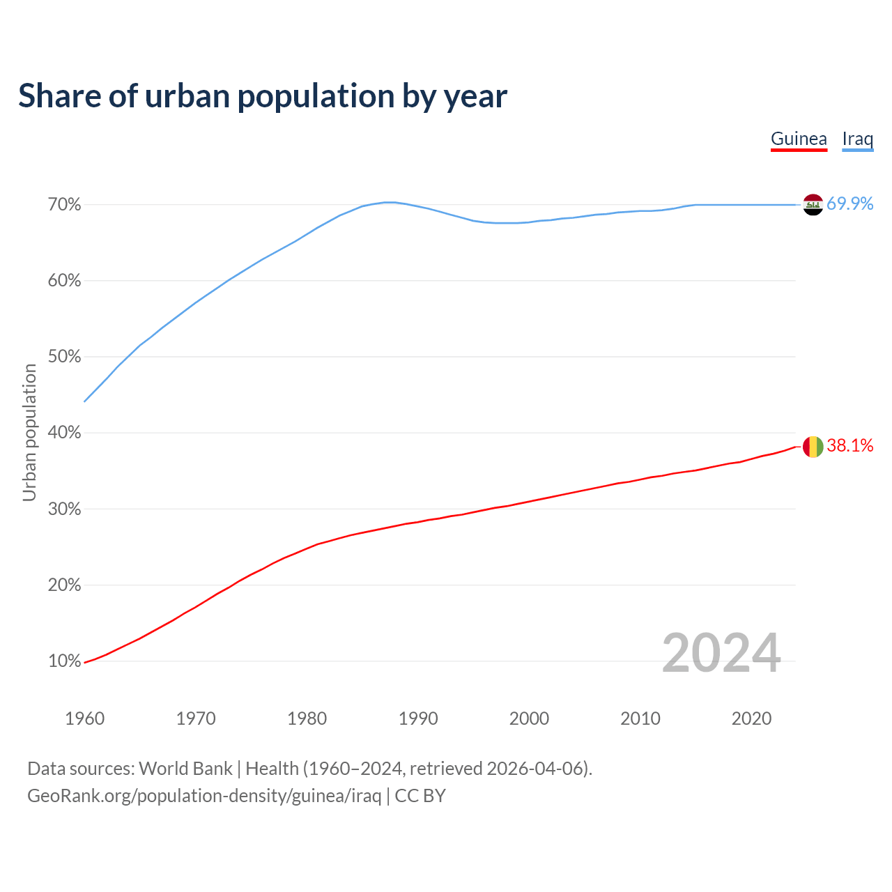 From 2004 to 2024, the share of urban population changed from 32.1% to 38.1% in Guinea and from 68.2% to 69.9% in Iraq.