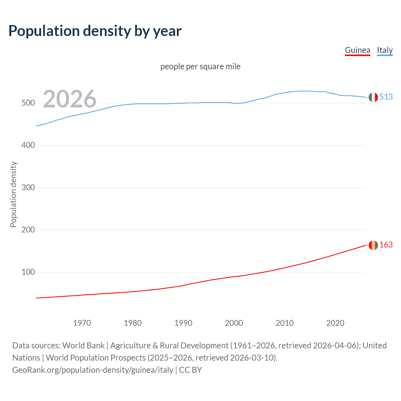 From 2006 to 2026, population density in Guinea increased by 63.7%, compared to a 0.28% growth in Italy.