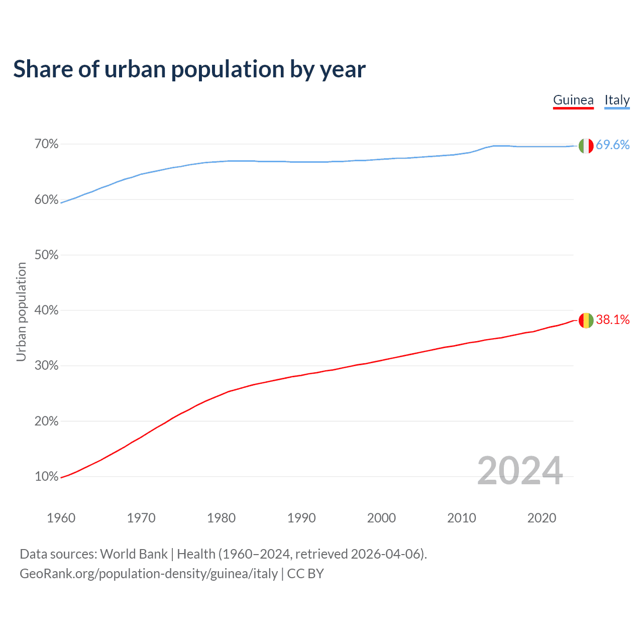 From 2004 to 2024, the share of urban population changed from 32.1% to 38.1% in Guinea and from 67.5% to 69.6% in Italy.