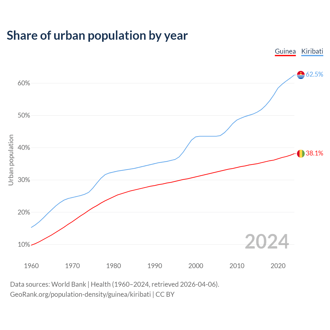 From 2004 to 2024, the share of urban population changed from 32.1% to 38.1% in Guinea and from 43.5% to 62.5% in Kiribati.