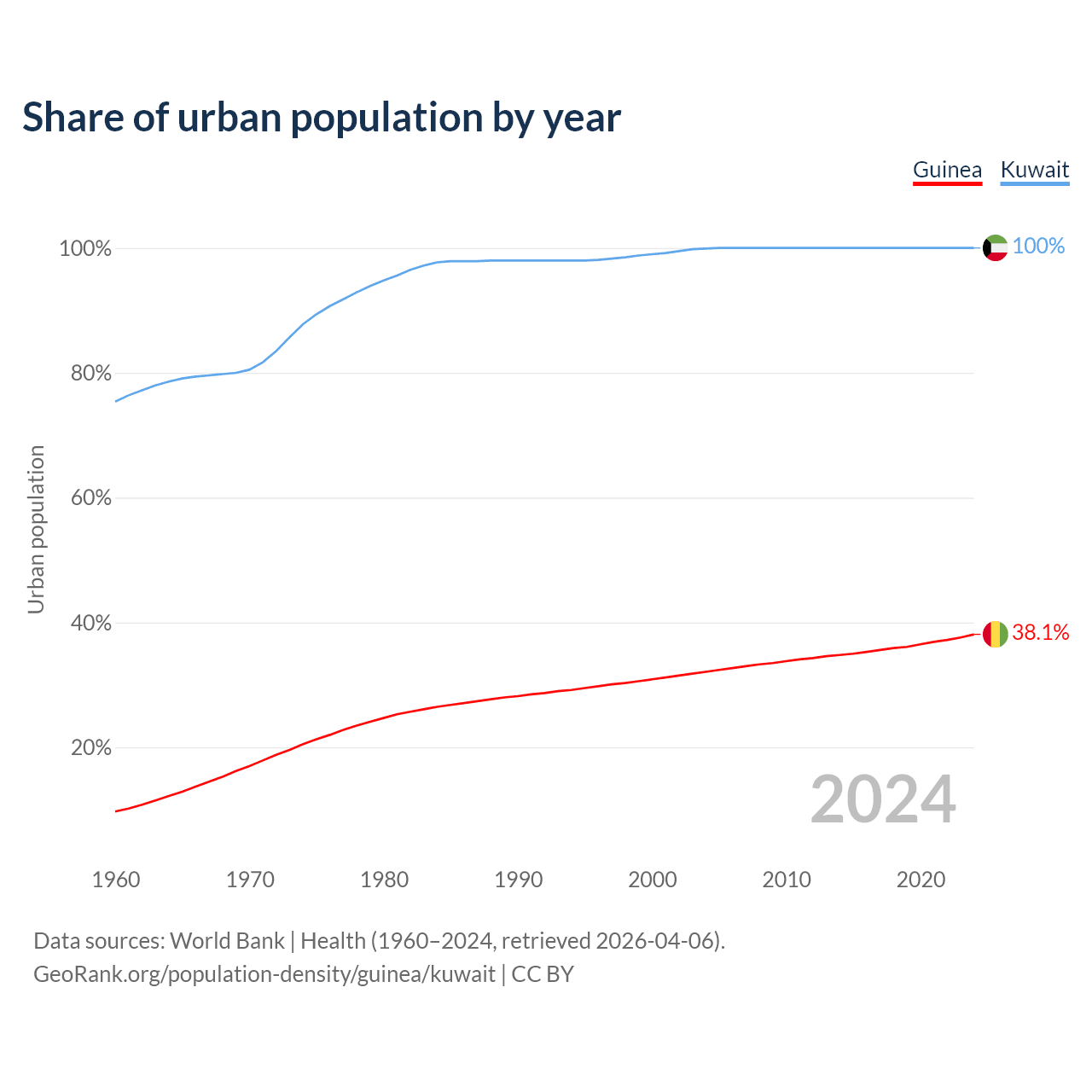 From 2004 to 2024, the share of urban population changed from 32.1% to 38.1% in Guinea and from 99.9% to 100% in Kuwait.