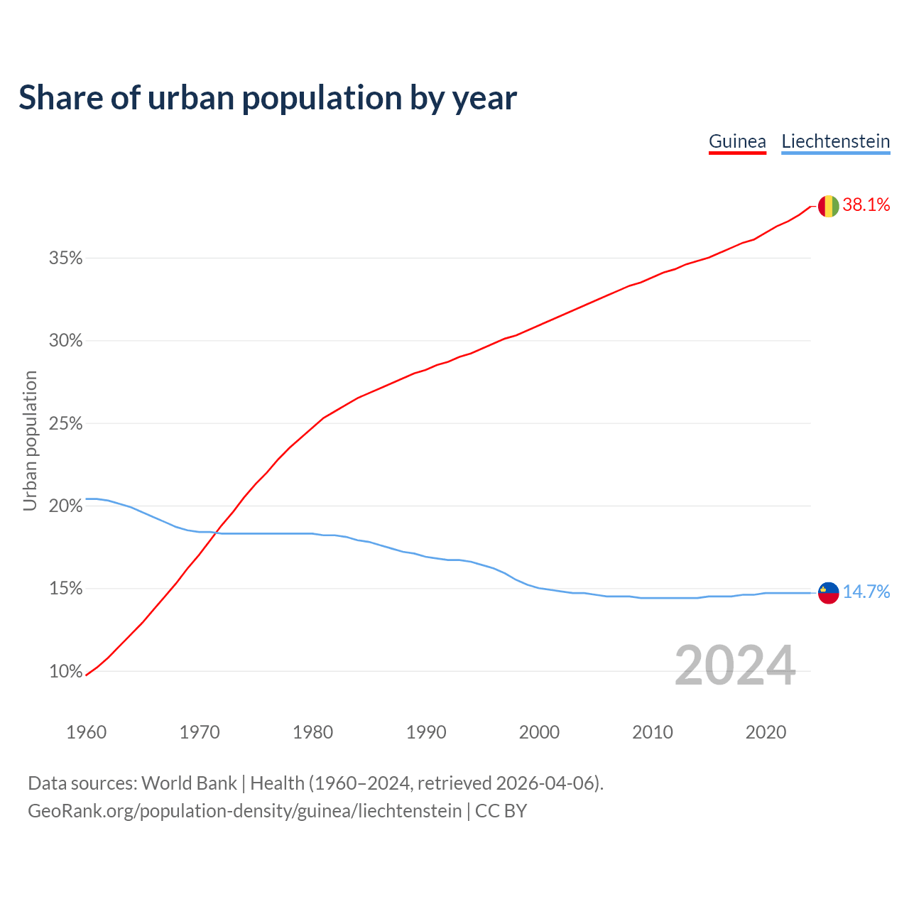 From 2004 to 2024, the share of urban population changed from 32.1% to 38.1% in Guinea and from 14.7% to 14.7% in Liechtenstein.