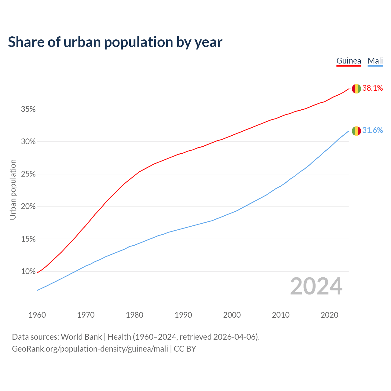 From 2004 to 2024, the share of urban population changed from 32.1% to 38.1% in Guinea and from 20.5% to 31.6% in Mali.