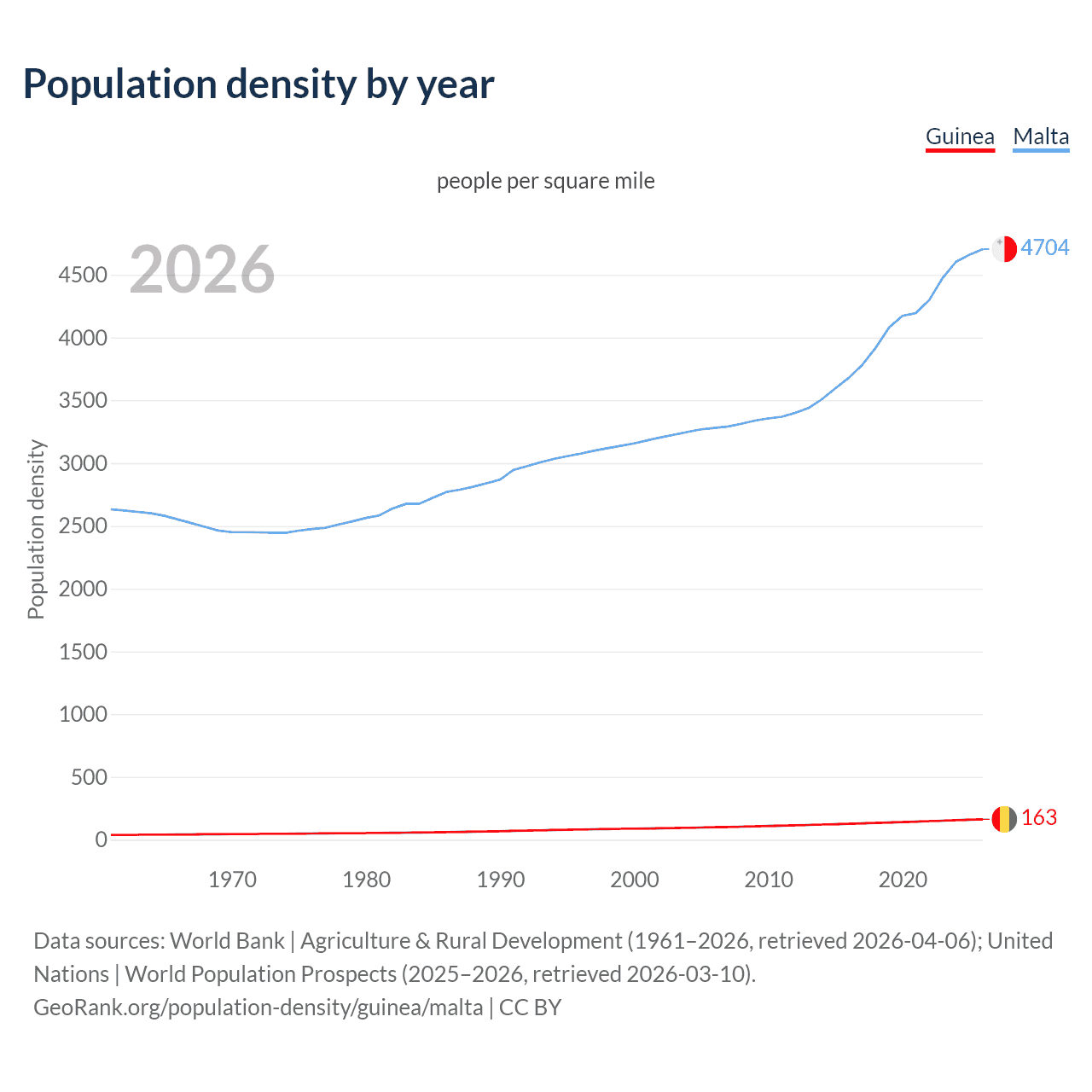 From 2006 to 2026, population density in Guinea increased by 63.7%, compared to a 43.4% growth in Malta.