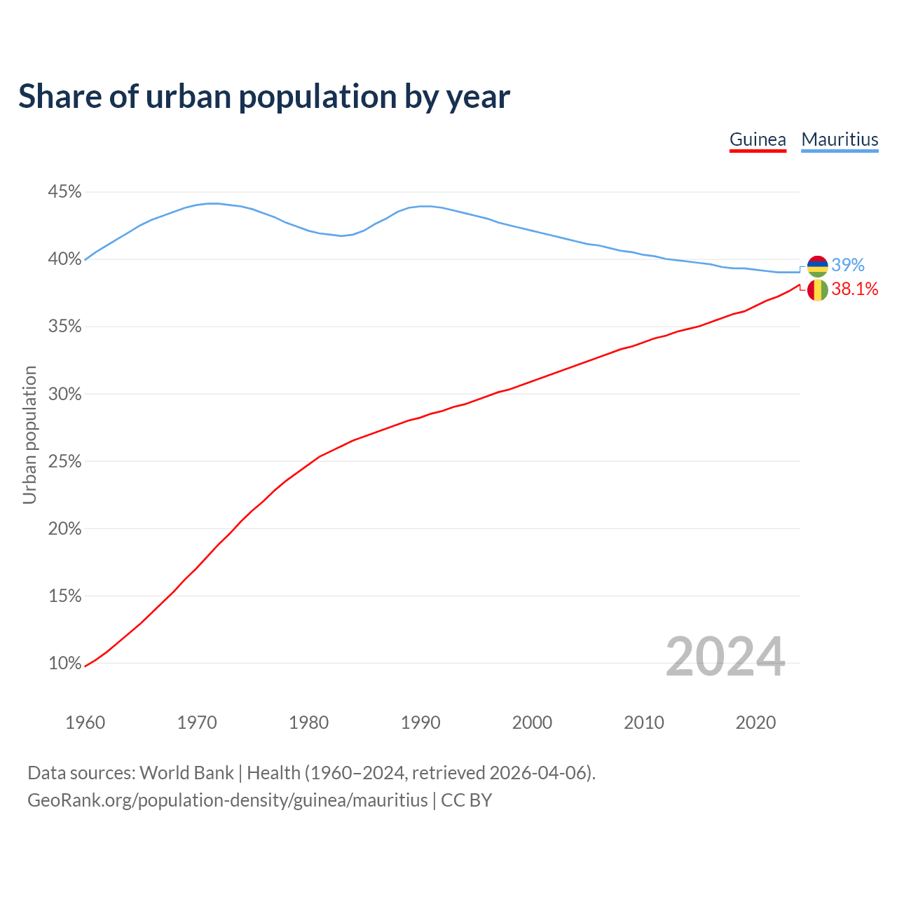 From 2004 to 2024, the share of urban population changed from 32.1% to 38.1% in Guinea and from 41.3% to 39% in Mauritius.