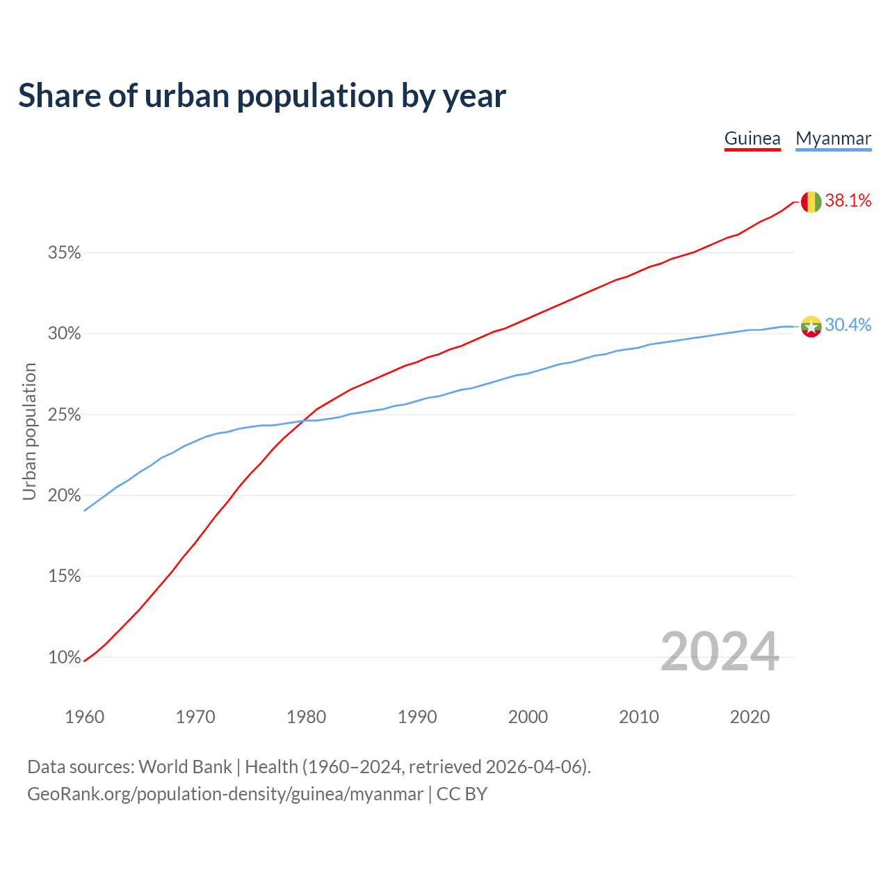From 2004 to 2024, the share of urban population changed from 32.1% to 38.1% in Guinea and from 28.2% to 30.4% in Myanmar.