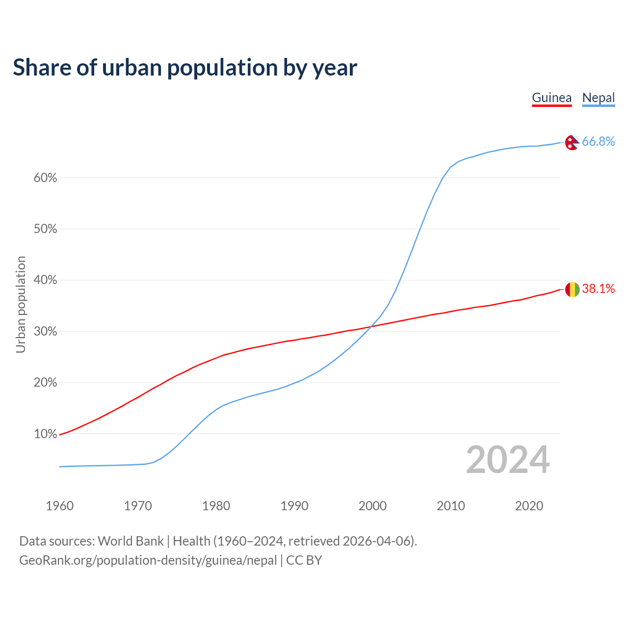 From 2004 to 2024, the share of urban population changed from 32.1% to 38.1% in Guinea and from 41.6% to 66.8% in Nepal.