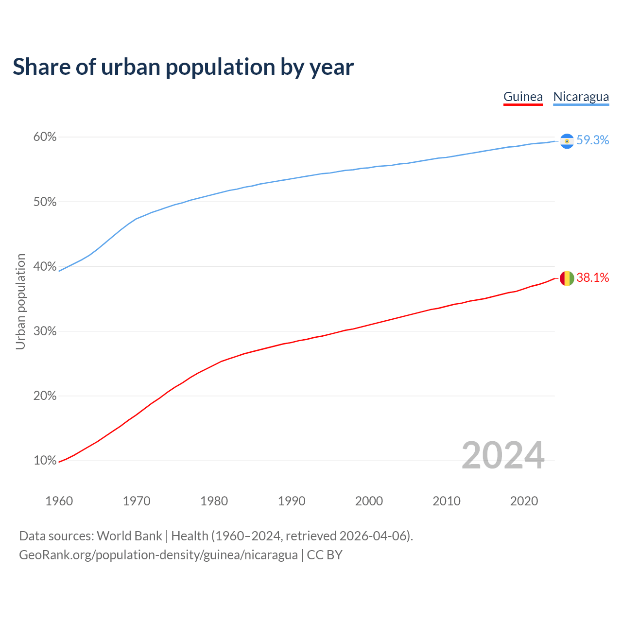 From 2004 to 2024, the share of urban population changed from 32.1% to 38.1% in Guinea and from 55.8% to 59.3% in Nicaragua.