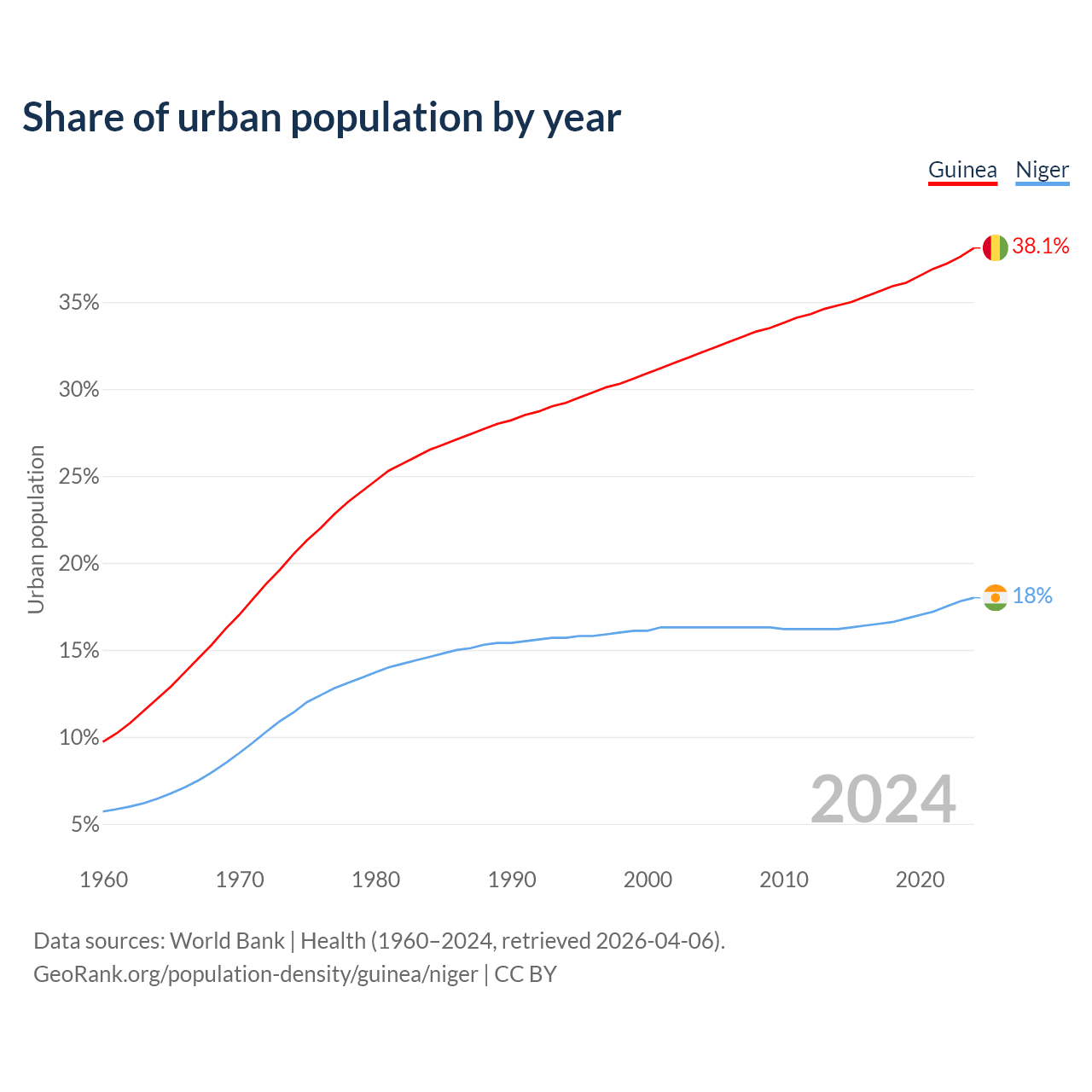 From 2004 to 2024, the share of urban population changed from 32.1% to 38.1% in Guinea and from 16.3% to 18% in Niger.