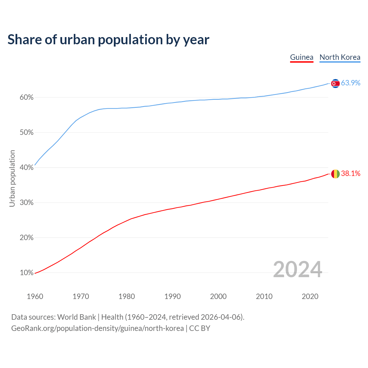 From 2004 to 2024, the share of urban population changed from 32.1% to 38.1% in Guinea and from 59.7% to 63.9% in North Korea.