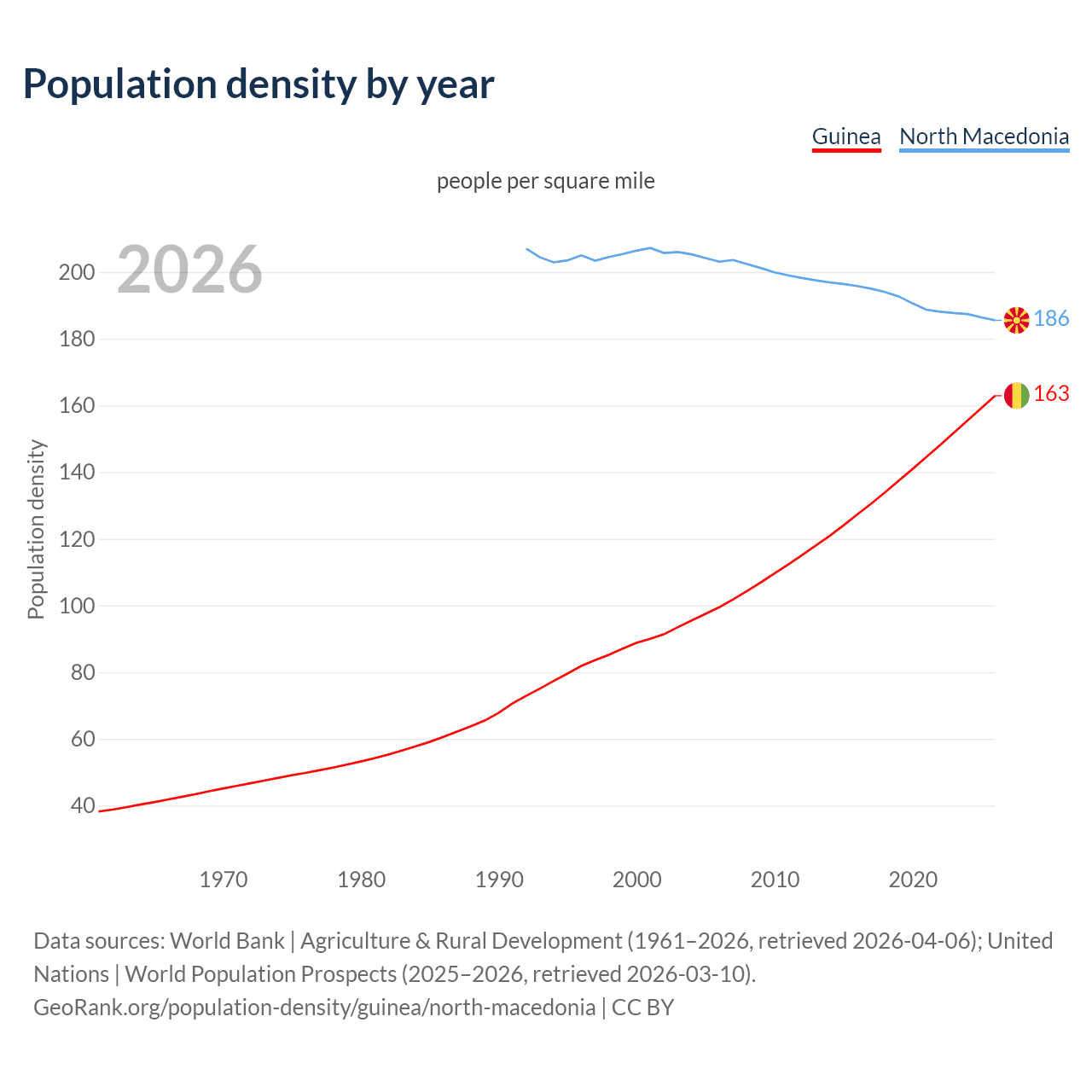 From 2006 to 2026, population density in Guinea increased by 63.7%, compared to a 8.69% decline in North Macedonia.