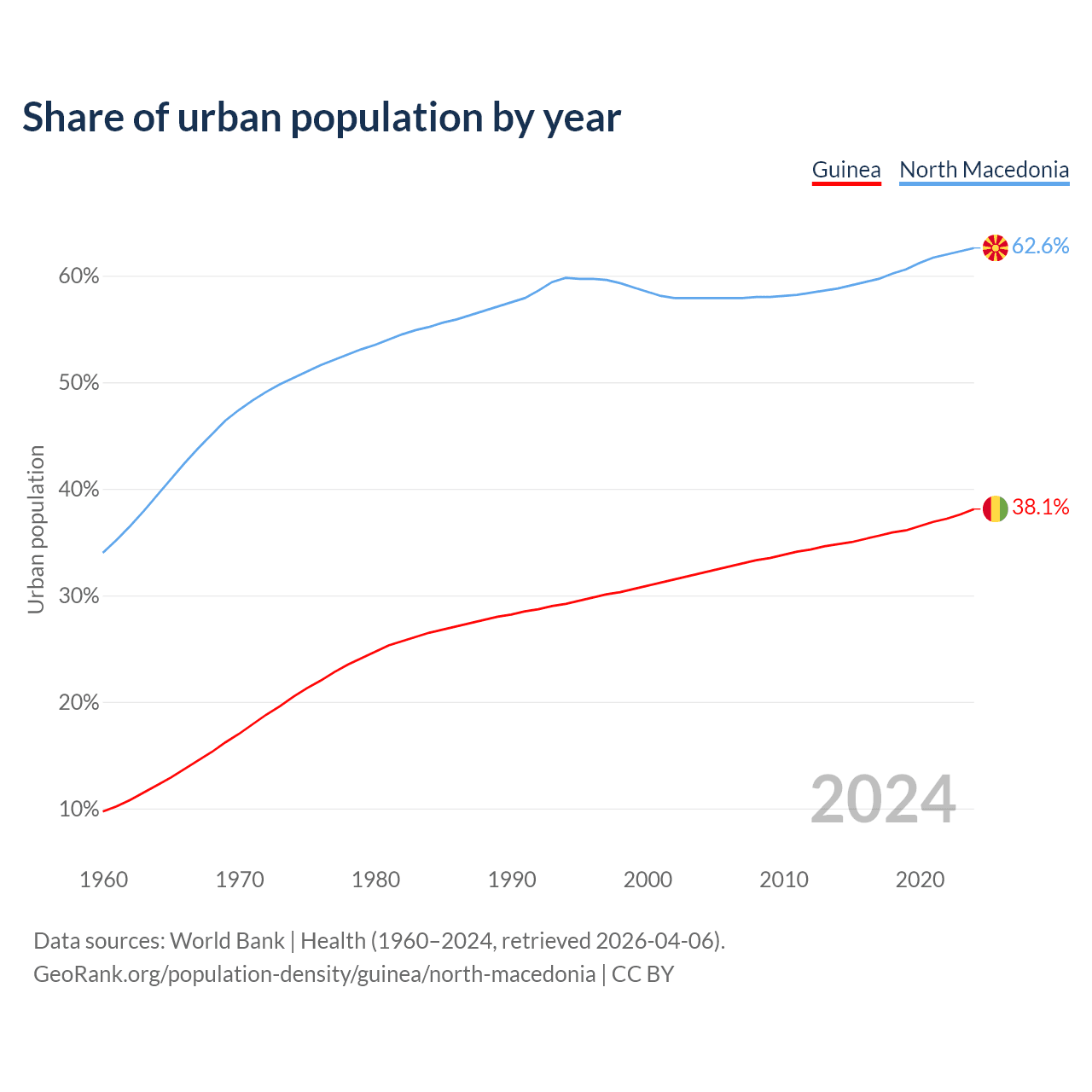 From 2004 to 2024, the share of urban population changed from 32.1% to 38.1% in Guinea and from 57.9% to 62.6% in North Macedonia.