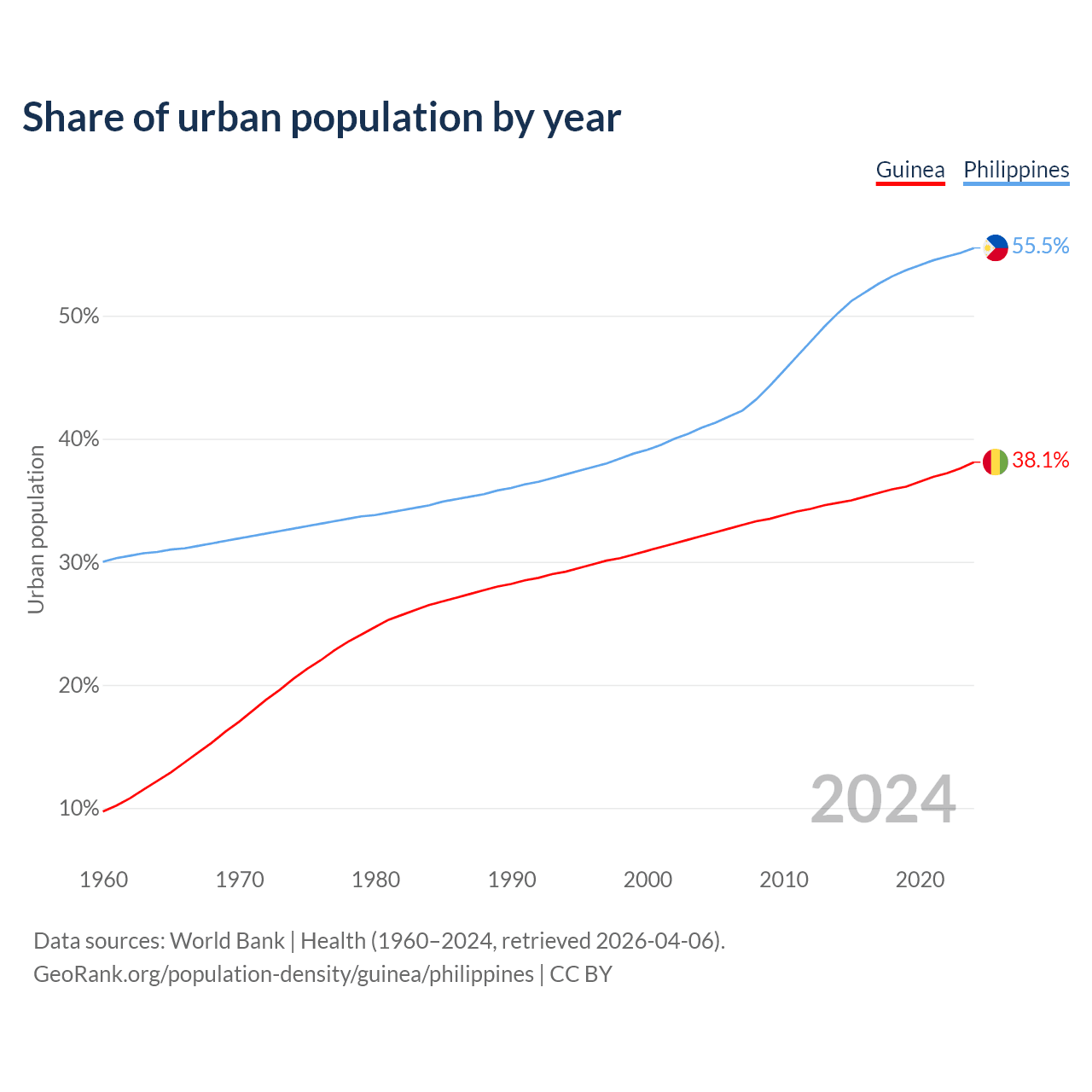 From 2004 to 2024, the share of urban population changed from 32.1% to 38.1% in Guinea and from 40.9% to 55.5% in the Philippines.