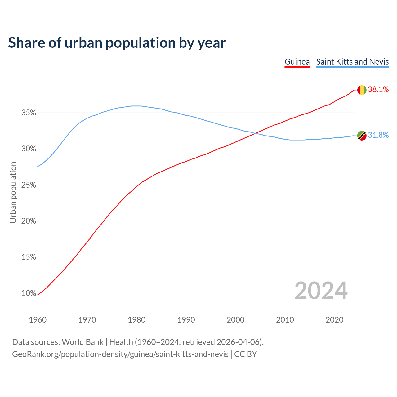 From 2004 to 2024, the share of urban population changed from 32.1% to 38.1% in Guinea and from 32.1% to 31.8% in Saint Kitts and Nevis.