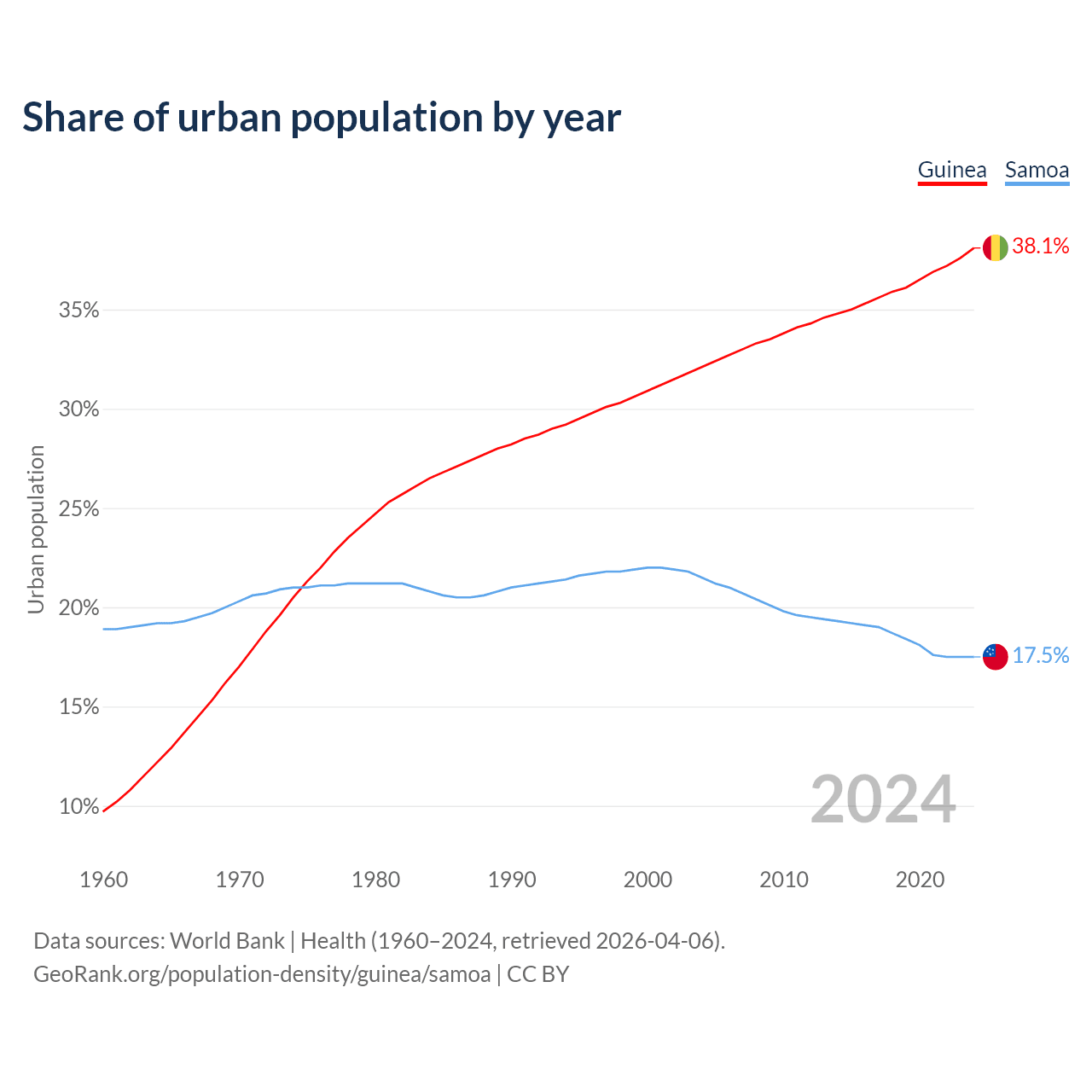 From 2004 to 2024, the share of urban population changed from 32.1% to 38.1% in Guinea and from 21.5% to 17.5% in Samoa.