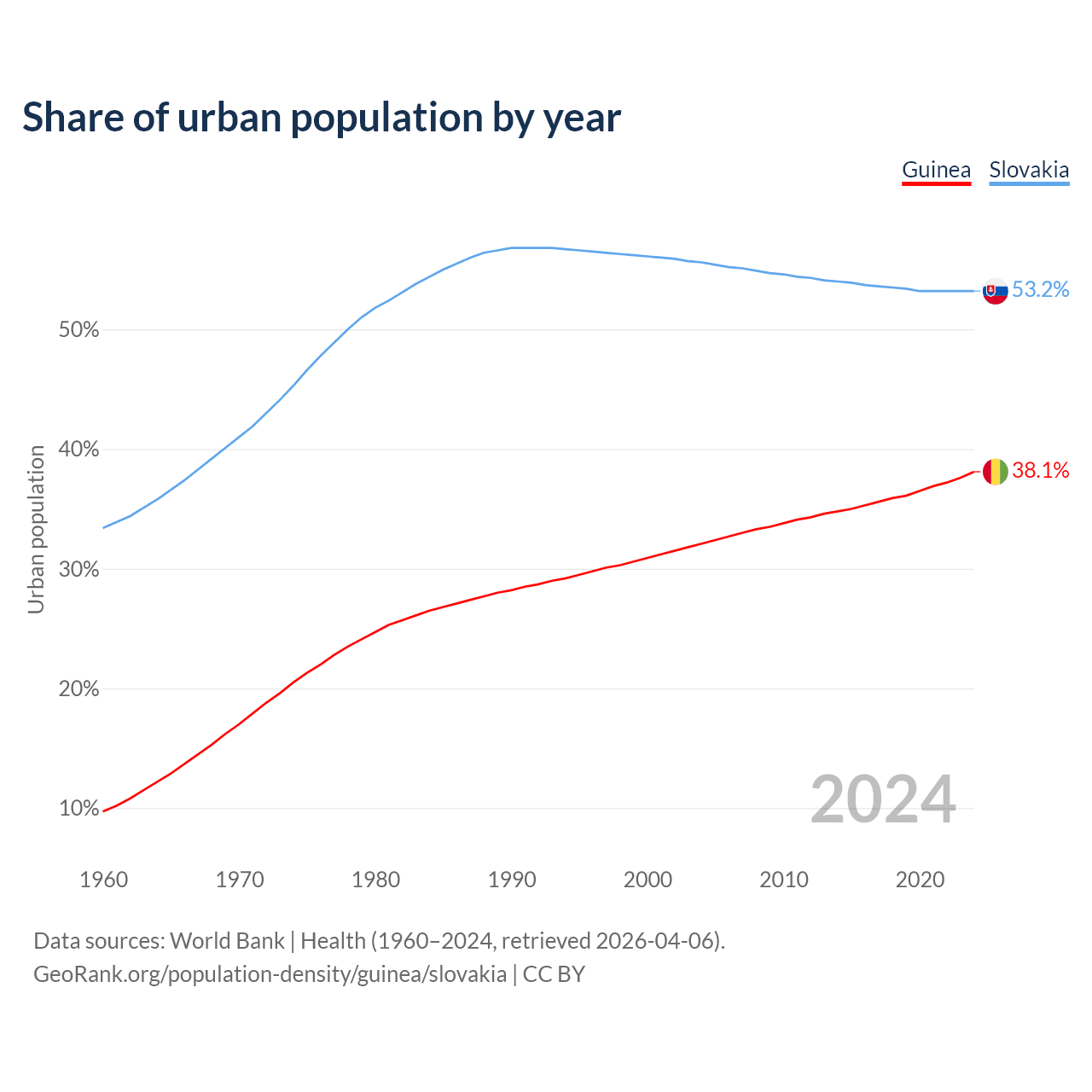 From 2004 to 2024, the share of urban population changed from 32.1% to 38.1% in Guinea and from 55.6% to 53.2% in Slovakia.