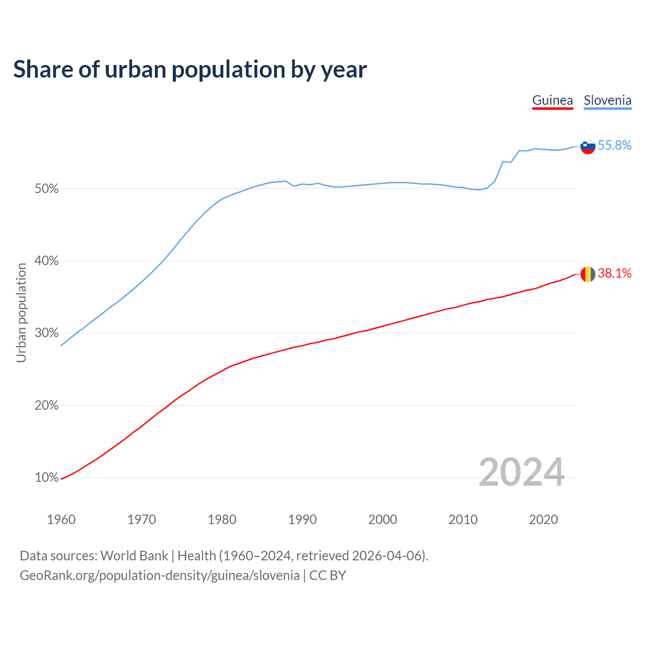 From 2004 to 2024, the share of urban population changed from 32.1% to 38.1% in Guinea and from 50.7% to 55.8% in Slovenia.