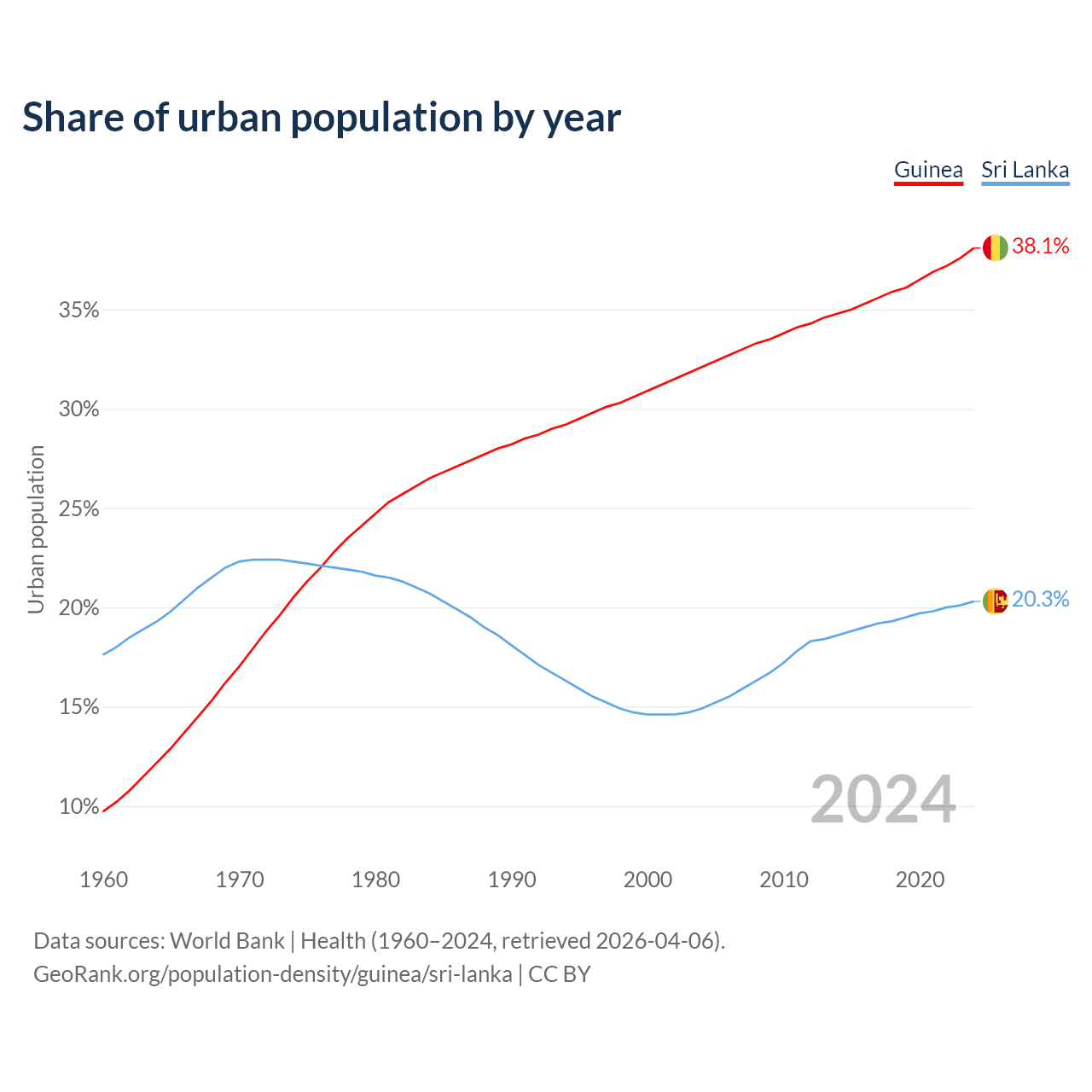 From 2004 to 2024, the share of urban population changed from 32.1% to 38.1% in Guinea and from 14.9% to 20.3% in Sri Lanka.