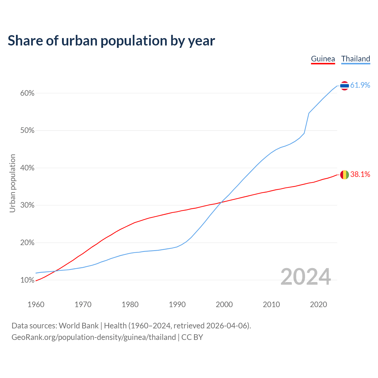 From 2004 to 2024, the share of urban population changed from 32.1% to 38.1% in Guinea and from 36.8% to 61.9% in Thailand.