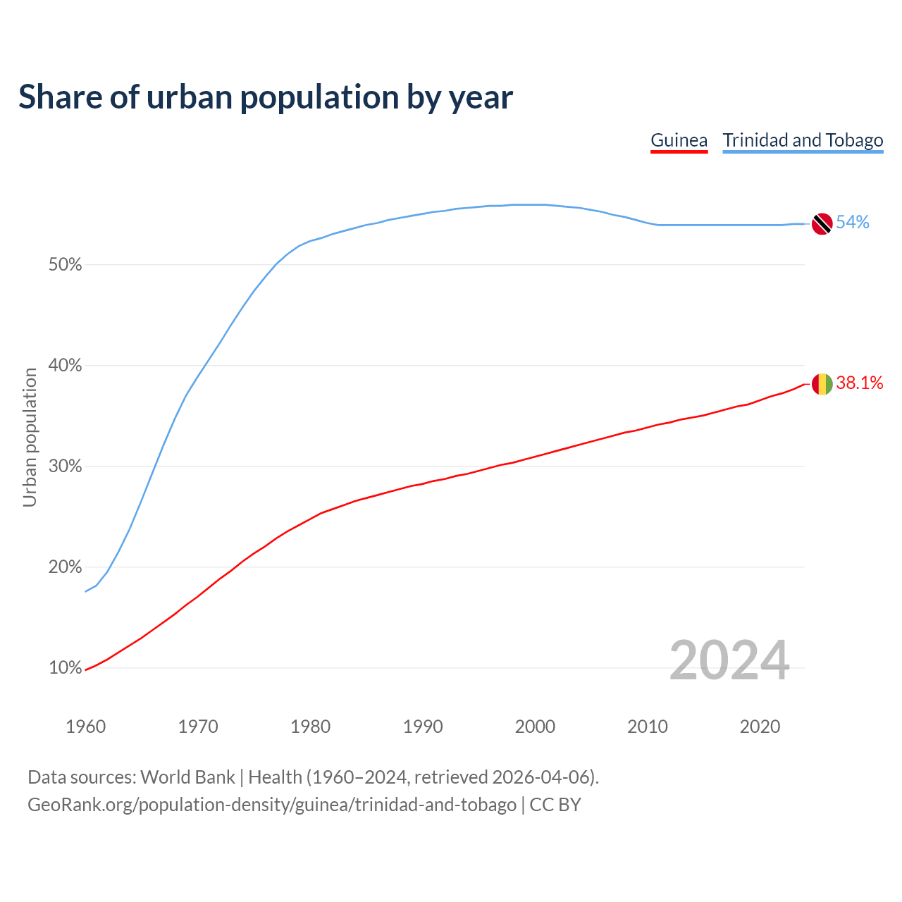 From 2004 to 2024, the share of urban population changed from 32.1% to 38.1% in Guinea and from 55.6% to 54% in Trinidad and Tobago.