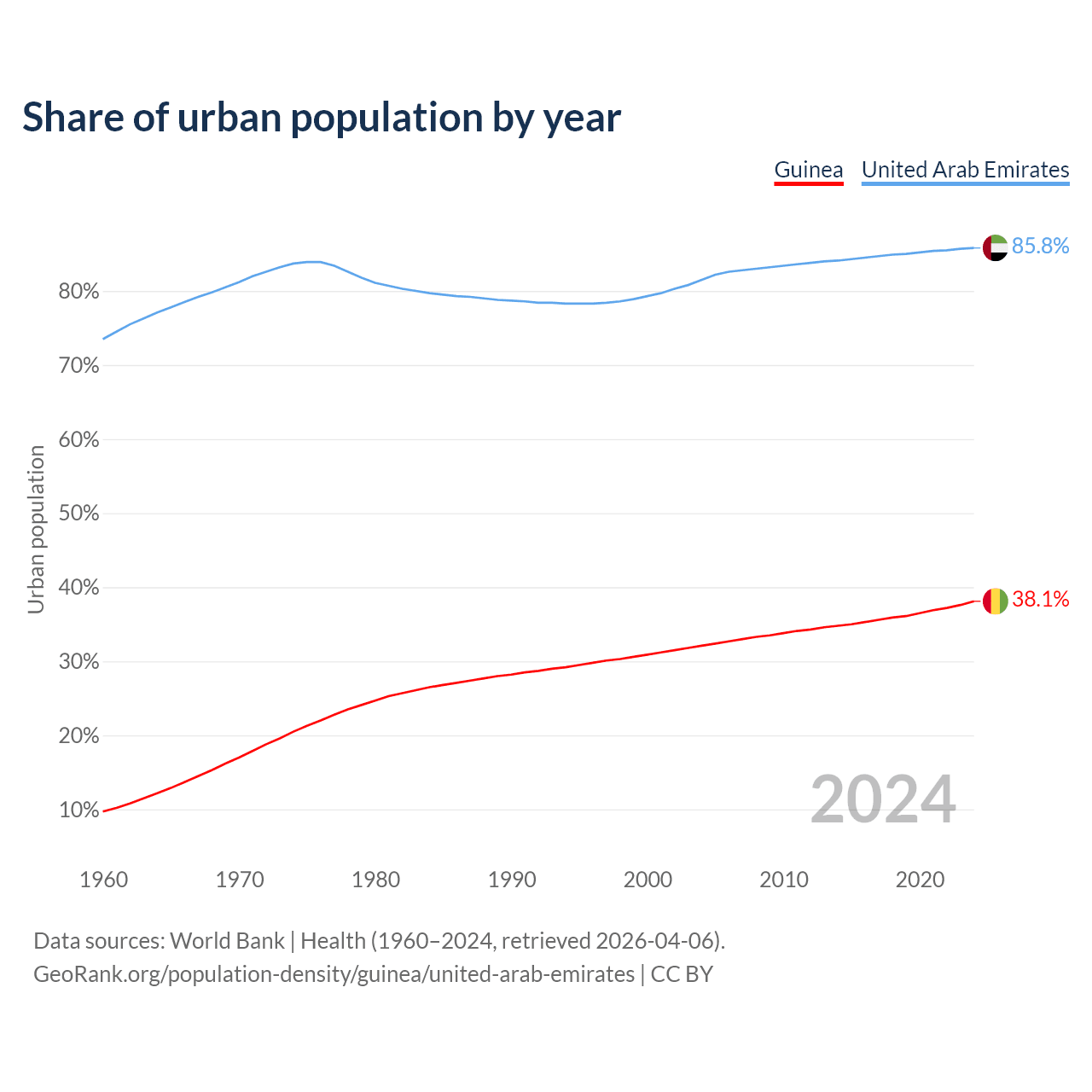 From 2004 to 2024, the share of urban population changed from 32.1% to 38.1% in Guinea and from 81.5% to 85.8% in the United Arab Emirates.