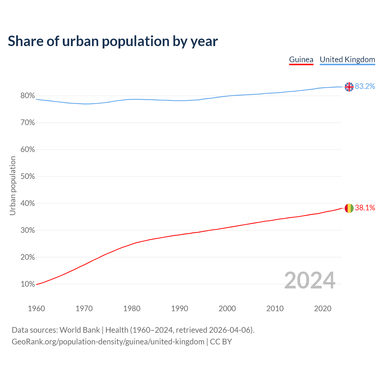 From 2004 to 2024, the share of urban population changed from 32.1% to 38.1% in Guinea and from 80.3% to 83.2% in the United Kingdom.
