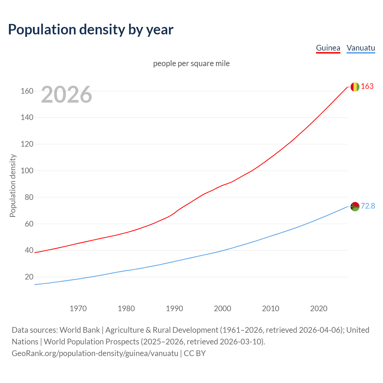 From 2006 to 2026, population density in Guinea increased by 63.7%, compared to a 58.7% growth in Vanuatu.